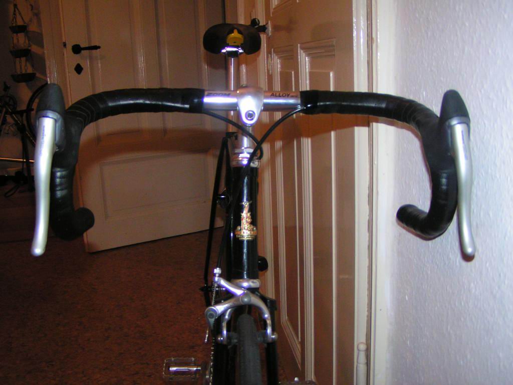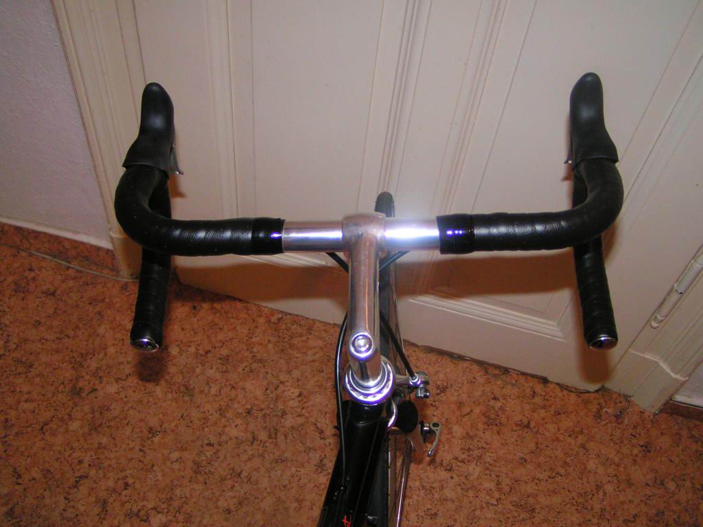 Zum Rad. Der Rahmen ist ca. Ende 70er aus Reynoldsrohren. Nix allzu besonderes aber die Aero-Rohrform gefällt mir. Die Räder sind 30mm Remerxfelgen (36 Loch vorn wie hinten) eingespeicht mit DT Comp auf einfachen (kaum gedichteten) Quandonaben, welche rollen wie sau.