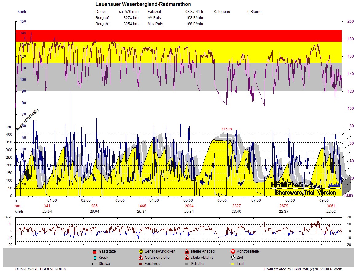 Ich kam oben an, dachte an Weltuntergang, Urlaub an der Südsee, nie wieder Fahrradfahren, also völlig wirres Zeug. Oben standen einige leidgeplagte Kollegen, die versuchten den Krämpfen an allen möglichen Körperstellen Herr zu werden. Wir waren ein Heer, das sich aufgerieben hat im Kampf um die beiden Burgen, um dann siegreich nach Lauenau zurückzukehren. Kraftundelegance fuhr dann komplettt mit mir nach Lauenau hinunter, wobei der Berg danach mit den 10% einen die Körner –1- bis –100 noch geklaut hat. Kurz vor Lauenau bekam dann leider einer meiner Mitfahrer einen Schwächeanfall, so dass wir langsam zu dritt den Marathon abgeschlossen haben. Nach 8,5 Stunden Fahrzeit, 219km und einer 3100m hohen Wand war dieser letzte Marathon des Jahres 2009 vorbei. Es waren ja auch genug dieses Jahr