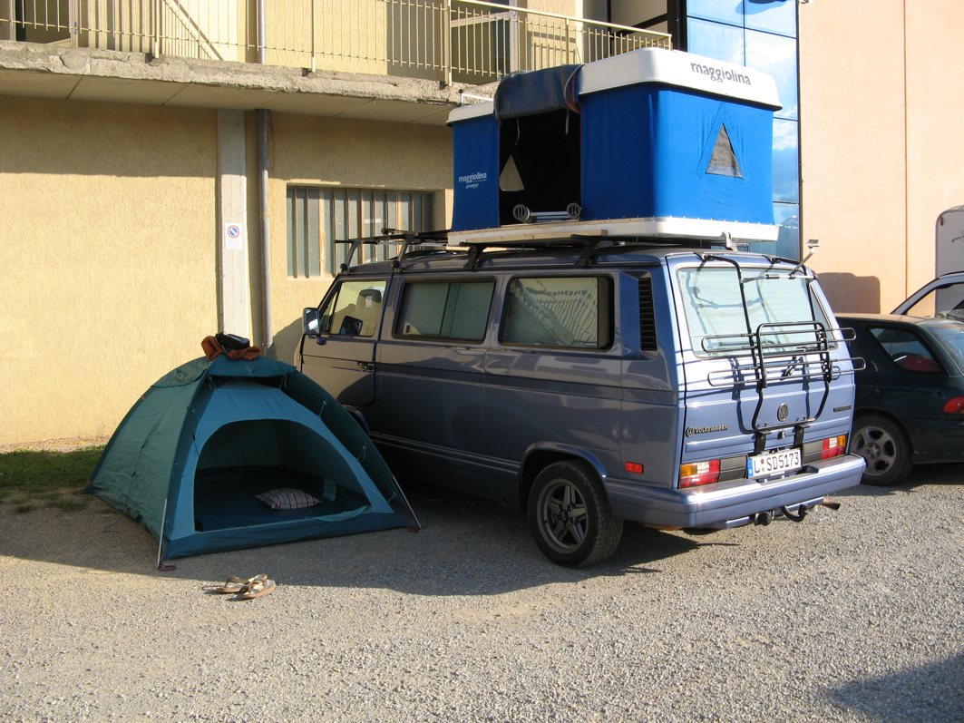 Nach 14 stündiger Anfahrt mit unserem auch schon fast historischen T3 Bus am Samstag angekommen, nahmen wir unseren „romantischen“ Zeltplatz auf dem Gelände eines kleinen Möbelwerkes ein.