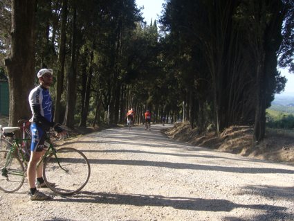 Anfangs moderat gewunden über Asphalt aus dem Ort hinaus, nach ein paar Kilometern nahte die erste durchaus knackige Steigung und es wurde auf Schotterbelag gewechselt. Wer die Toskana kennt, weiß, dass es immer mal wieder Rampen mit 15-18% Steigung gibt.