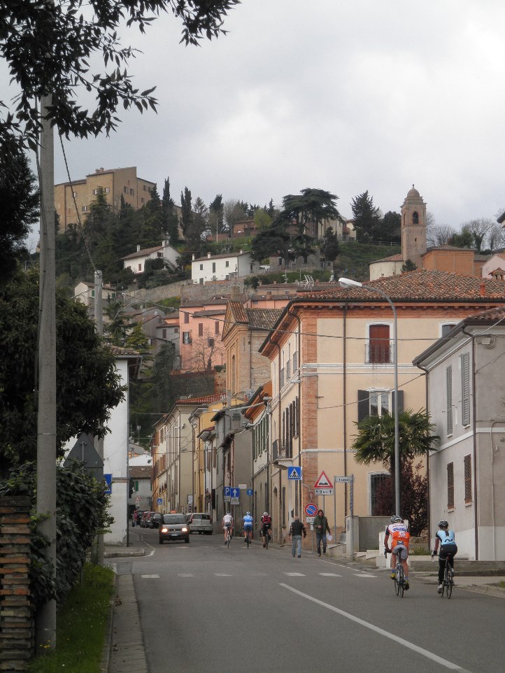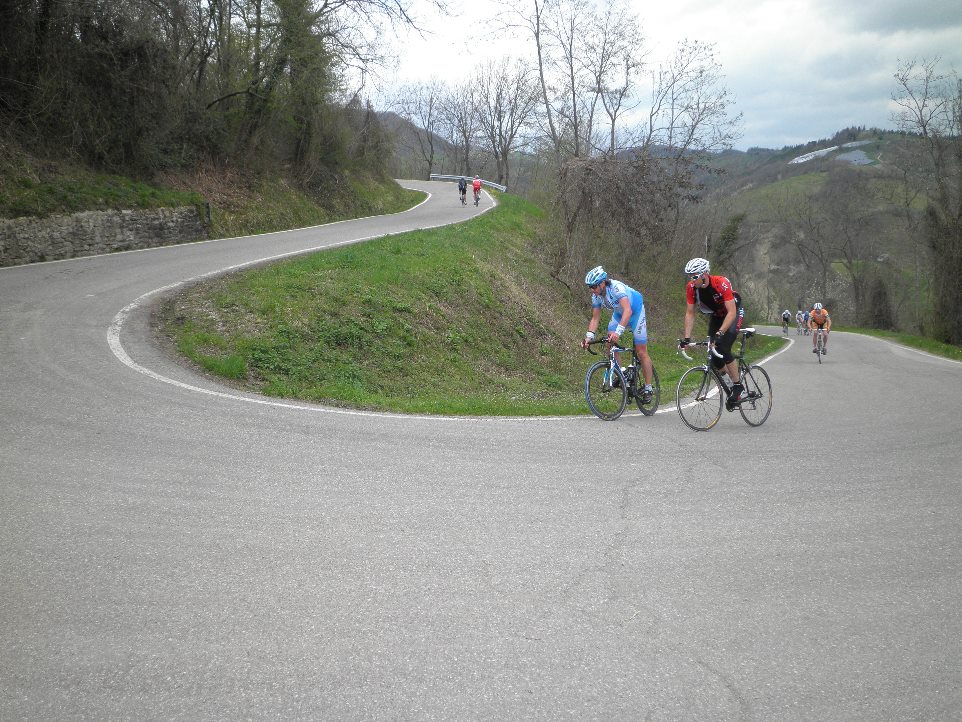 Der erste Hügel ist zum Einfahren gedacht: ein paar Stücke im zweistelligen Prozentbereich und schon spreizte sich das Peloton weit auf. Im kleinen aber feinen Ort Bertinoro mit herrlicher Sicht zur Küste der Adria schnauften die ersten, wenig bergfesten Fahrer (oder die am Vortag schon zu viel gemacht haben) schon gewaltig und verabschiedeten sich aus der Runde. Ein paar Rampen mit bis 14% führten auf kleiner, gewundener Straße weiter in das Dorf Polenta und der erste Hügel ward schon geschafft. Die Abfahrt nach Meldola nahm ich wie gewohnt vorsichtig und damit als Letzter... Nun folgte ein etwas längeres welliges Stückchen in einem ruhigen Tal und die Gruppe arbeitete zusammen an einem zügigen Tempo, das meinen Puls teilweise in ungewollte Höhen trieb. In Piandispino endete jäh die flotte Fahrt und Serpentinen starten den