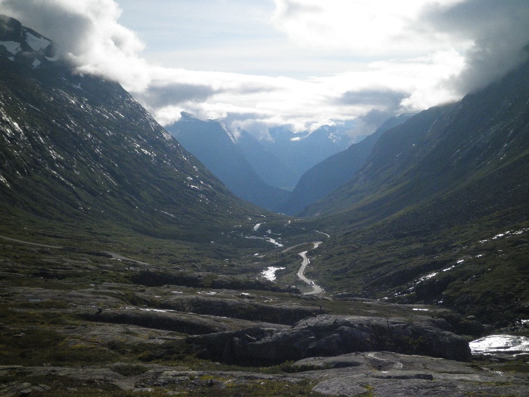 Die Straße zieht sofort wieder deutlich an ich merke, dass ich bis hierhin schon ein paar Körner gelassen habe. Na ja, sind nur noch gute 400 hm am Stück, das werde ich auch noch schaffen, man muss sich das im Kopf nur passend zurechtrücken. Die Straße geht in mehr oder weniger engen Serpentinen recht gleichmäßig und mittlerweile unerbittlich bergan. Als nur noch knapp 100 hm übrig sind, muss ich auf Kampfmodus umschalten, Motivation ist jetzt alles. Da kann mich der einsetzende Nebel auch nicht mehr stören. Ich will jetzt da hoch!!! Hier oben ist es schon ziemlich frisch, aber ich fahre immer noch kurz/kurz und friere nicht. Und dann habe ich es geschafft: Dalsnibba, mit knapp 1500 Metern der höchstgelegene Aussichtspunkt auf einen Fjord in Europa, den man auf einer Straße erreichen kann. Ziemlich kaputt krabble ich vom Rad und stopfe Essen und Trinken gierig in mich rein. Erst jetzt wird mir so richtig bewusst, dass momentan die Sichtweite durch die Wolken auf ca. 100 Meter beschränkt ist, aber da ich nicht weiß, was mir hier entgeht (das schaue ich mir erst zu Hause an), bin ich auch nicht so sehr enttäuscht. Ein paar redselige Damen aus der Schweiz sprechen mich an und überreden mich, dass sie von mir unbedingt ein „Gipfelfoto“ machen. Ich bin zu keinem Widerspruch fähig. Danach ziehe ich mir alle Klamotten an, die ich bei mir habe, denn die Abfahrt wird bei aktuell 8°C nicht gemütlich. Gerade kommen noch drei Reisebusse an und schütten allerlei Touristen aus und so wird Zeit, dass ich hier wieder verschwinde. Zunächst bergab bei schönen Ausblicken zurück zum Djupvatnet, wo ich in der Djupvasshytta ein Süßgebäck der Region (Name leider vergessen, eine Art Pfannkuchen mit viel Zucker und Butter) verspeise. Derart gestärkt geht es weiter durch die Gebirgslandschaft. Ich fahre an mehreren Seen entlang (Djupvatnet, Langvatnet, Breiddalsvatnet), durch ein sich aufweitendes und später sehr weites Tal ohne groß an Höhe zu verlieren.
