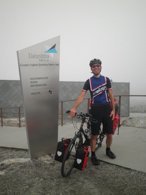 Die Straße zieht sofort wieder deutlich an ich merke, dass ich bis hierhin schon ein paar Körner gelassen habe. Na ja, sind nur noch gute 400 hm am Stück, das werde ich auch noch schaffen, man muss sich das im Kopf nur passend zurechtrücken. Die Straße geht in mehr oder weniger engen Serpentinen recht gleichmäßig und mittlerweile unerbittlich bergan. Als nur noch knapp 100 hm übrig sind, muss ich auf Kampfmodus umschalten, Motivation ist jetzt alles. Da kann mich der einsetzende Nebel auch nicht mehr stören. Ich will jetzt da hoch!!! Hier oben ist es schon ziemlich frisch, aber ich fahre immer noch kurz/kurz und friere nicht. Und dann habe ich es geschafft: Dalsnibba, mit knapp 1500 Metern der höchstgelegene Aussichtspunkt auf einen Fjord in Europa, den man auf einer Straße erreichen kann. Ziemlich kaputt krabble ich vom Rad und stopfe Essen und Trinken gierig in mich rein. Erst jetzt wird mir so richtig bewusst, dass momentan die Sichtweite durch die Wolken auf ca. 100 Meter beschränkt ist, aber da ich nicht weiß, was mir hier entgeht (das schaue ich mir erst zu Hause an), bin ich auch nicht so sehr enttäuscht. Ein paar redselige Damen aus der Schweiz sprechen mich an und überreden mich, dass sie von mir unbedingt ein „Gipfelfoto“ machen. Ich bin zu keinem Widerspruch fähig. Danach ziehe ich mir alle Klamotten an, die ich bei mir habe, denn die Abfahrt wird bei aktuell 8°C nicht gemütlich. Gerade kommen noch drei Reisebusse an und schütten allerlei Touristen aus und so wird Zeit, dass ich hier wieder verschwinde. Zunächst bergab bei schönen Ausblicken zurück zum Djupvatnet, wo ich in der Djupvasshytta ein Süßgebäck der Region (Name leider vergessen, eine Art Pfannkuchen mit viel Zucker und Butter) verspeise. Derart gestärkt geht es weiter durch die Gebirgslandschaft. Ich fahre an mehreren Seen entlang (Djupvatnet, Langvatnet, Breiddalsvatnet), durch ein sich aufweitendes und später sehr weites Tal ohne groß an Höhe zu verlieren.
