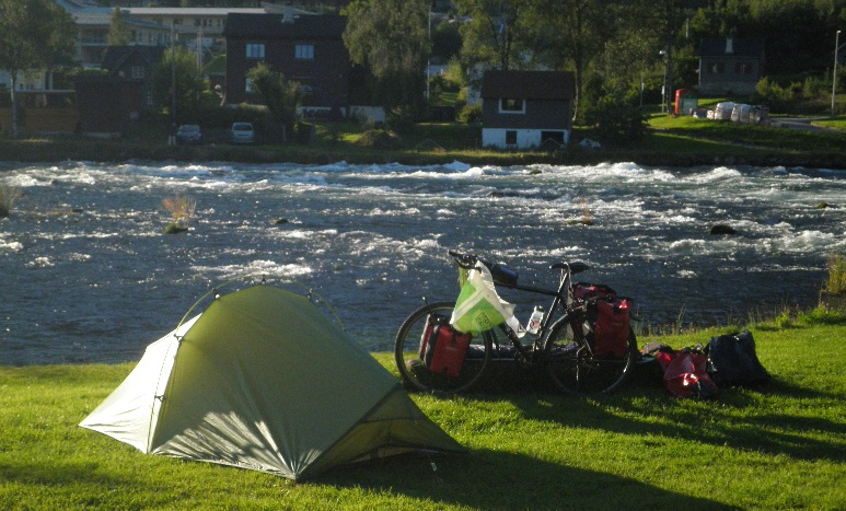 Ich fahre weiter durch ein relativ enges und dadurch düsteres Tal. Aber in Skei öffnet sich die Landschaft wieder und das Jølstravatnet wird mich bis zum Ende der heutigen Etappe begleiten. Ich fahre am südlichen Ufer auf einer sehr ruhigen, kleinen Straße entlang dieses Sees, einfach himmlisch bei diesem Wetter! Ein paar Rennradler drehen hier ihre Feierabend-Runde und wir quatschen etwas miteinander. Dann wird es langsam Zeit, ein Nachtlager zu suchen. Den ersten Zeltplatz am See lasse ich nach einer kurzen Inspektion der sanitären Einrichtungen links liegen. In dem kleinen Ort Vassenden, an der Stelle, wo der See seinen natürlichen Abfluss hat, finde ich einen traumhaften, kleinen Zeltplatz, direkt an dem Fluss Jølstra. Die Lage ist toll und die sanitären Einrichtungen super toll gepflegt. Ich habe erst Bedenken, dass ich direkt an dem doch recht lauten Wasserlauf keinen Schlaf finden werde, aber schnell falle ich ins Koma.