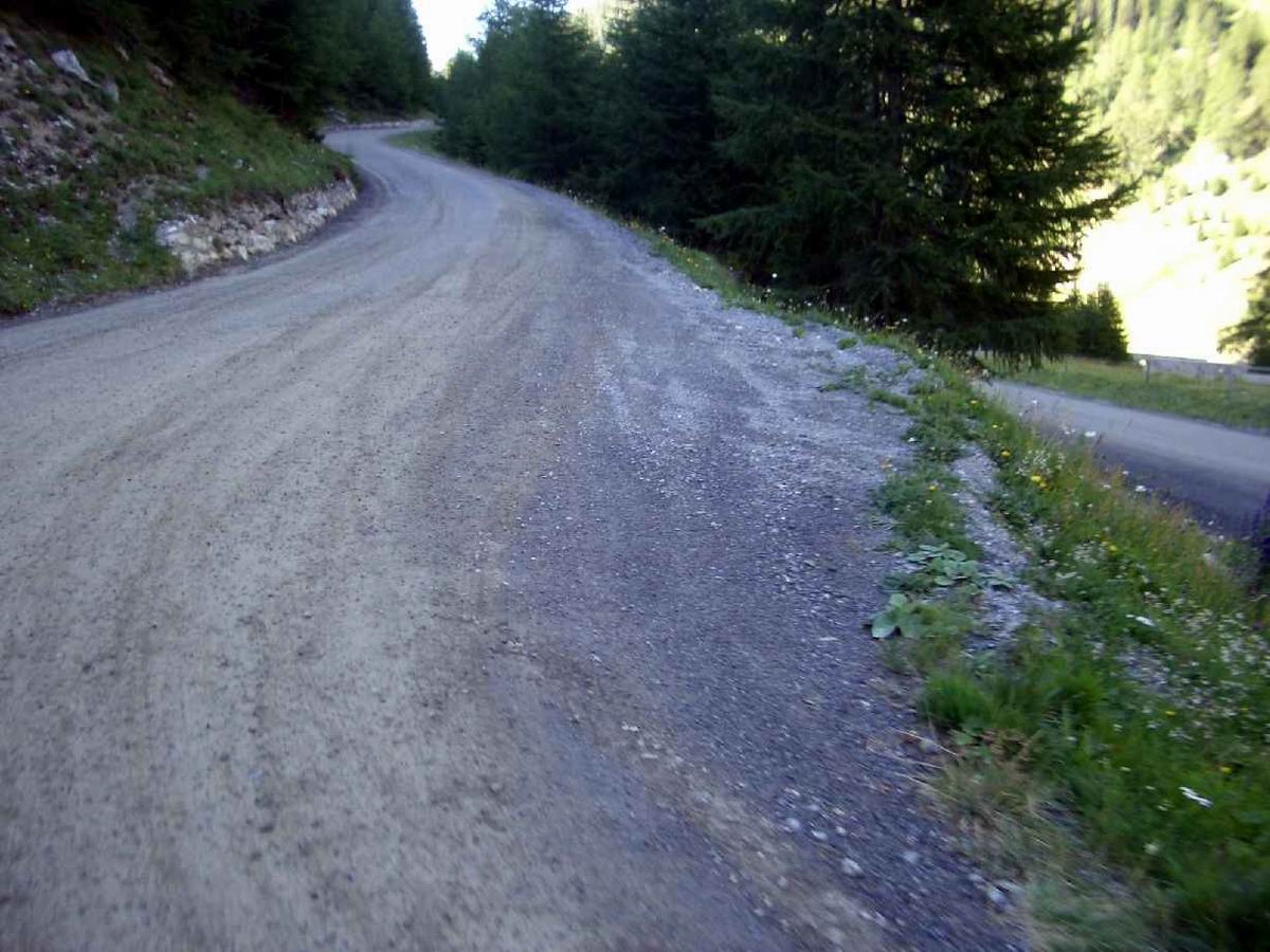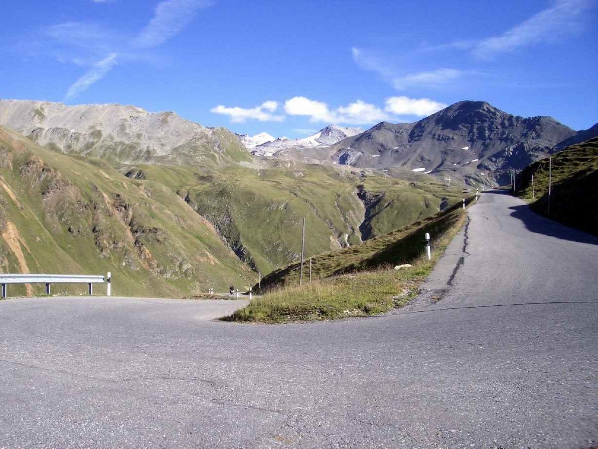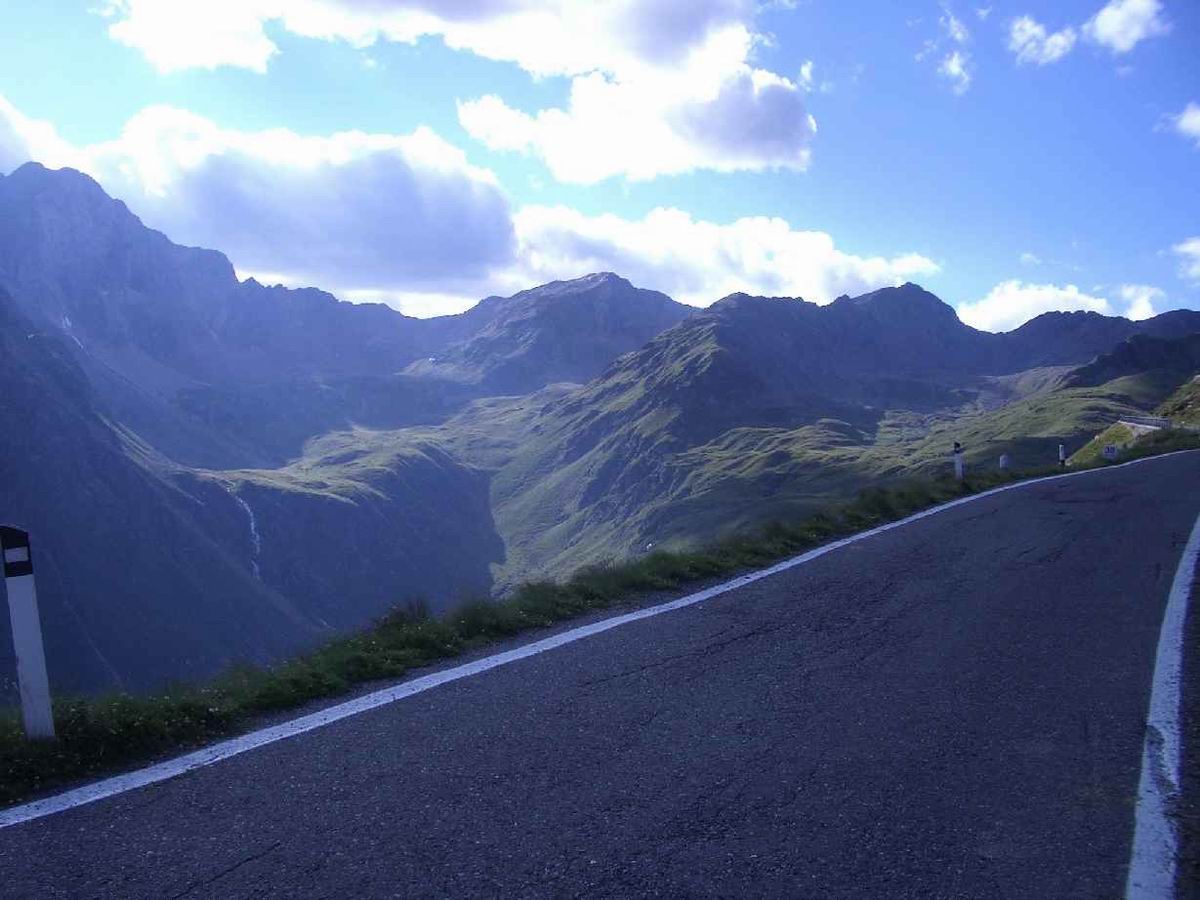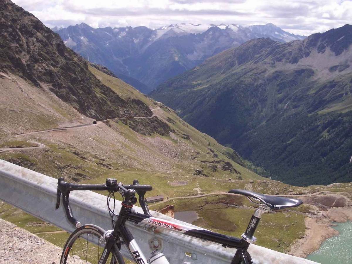 2. Tag: St. Nicolo - Gavia-Pass (2618) - Ponte di Legno - Gavia-Pass - St. Nicolo Der Gavia ist sehr zu empfehlen: wild und relativ wenig befahren. In beiden Rampen Steigungsmaxima von 16%, wobei auf der Südseite mal ein längeres derartiges Stück zu bewältigen ist. Psychologisch delikat, wenn man es unmittelbar vorher runtergefahren ist und genau weiß, was einen noch erwartet. Das gilt auch für den Tunnel. 200 unbeleuchtete Meter. Bergab konnte ich einen Motorradfahrer bitten, mit Licht und Warnblinker auszuhelfen. Auf dem Rückweg bin ich dann nur mit der Blinkfunzel am Helm durchgefahren. Unglaublich, wie dunkel ein Tunnel wird, wenn keine Reflektoren an den Wänden mehr Orientierung bieten. Volle Konzentration auf das Licht am Ende weil man schnell zu eiern anfängt, wenn man bei ca. 8-9% Steigung mit der Tachobeleuchtung rumspielt und die Fahrbahn unter sich nicht mehr sieht; 87km, 2666hm