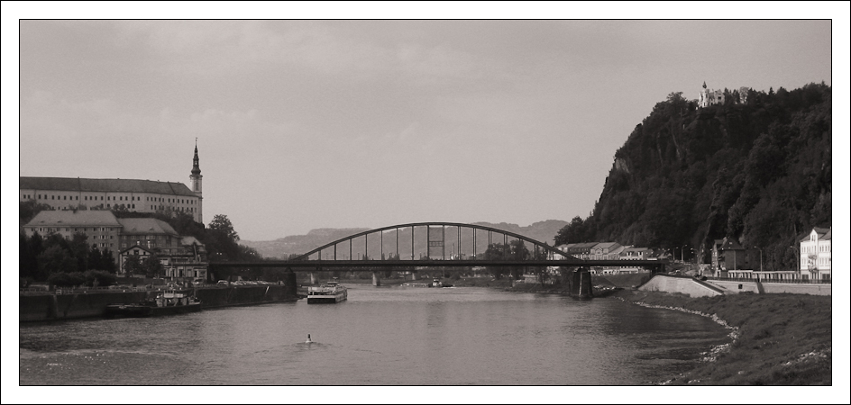 Dieses burgähnliche Gemäuer rechts oben? Genau, dachte ich mir auch, besuchte vorher aber die "Bělská"...einen 400m kurzen, kaum fahrradbreiten Pfad (Profil zwei Beiträge weiter oben), der gleich mit deutlich > 20% die Kette auf 39x27 zwingt. Aber es geht nach 16 km natürlich noch recht geschmeidig. Dann die von "bejar" rekognoszierte Auffahrt zum Děčíner Zoo. Mögen es 18-20% sein...auf Kopfsteinpflaster. :anbetung: Das muß also im Sitzen gehen...und es geht...meine Beine hatten einen Goldtag erwischt. Ein paar Meter weiter öffnet sich der Blick auf die Labe. Leider ist es erneut dunstig, aber man hat die umliegenden Berge sicher im Blick.