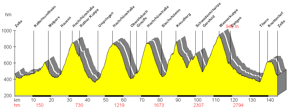 Boris befragt mal wieder die grünen Zacken des Garminprofils und erkennt endlich die höchste Spitze des Tages schon fast vor uns. Zunächst quälen wir uns durch den wirklich üblen Verkehr in Richtung "Schwedenschanze", an die ich nur die allerschlechtesten kulinarischen Erinnerungen habe, als ich hier früher oft auf dem Weg nach Marburg gehalten hatte. Immerhin ab Oberweißenbrunn begleitet endlich ein vernünftiger Radweg die Bundesstraße nach Gersfeld. Ein Radladen verkauft Boris zu Apothekenpreisen vermeintliche Look-Keo-Pedalplatten, die sich später natürlich als unpassend zu allen uns bekannten System herausstellten. Aber endlich, die Wasserkuppe!. Der höchste Berg der Rhön, die Wiege des Segelflugsports und regenreiches Quellgebiet von dreißig Gewässern. Und ein trostlos-langweiliger Anstieg. Mit etwas Form käme man sicher auch mit der Scheibe zumindest bis zur Fuldaquelle. Dann wird es etwas steiler und dröhnen bereits die Motoren der Flugzeuge über die windige Kuppe des Berges. Leider verpasse ich es, die gerühmten Bratwürste vom Rhönschaf zu probieren und eile mit Boris bei einsetzendem Regen in die schnelle, aber jetzt schon gefährlich nasse Abfahrt. Mit den bekannten Stecknadeln piesackt uns die Wetterunbill im Gesicht, als wir stetig an Höhe verlierend uns vorsichtig ins Tal der Ulster bremsen. Einen uns mit überschießender Fahrt überholenden Rennradler ignorieren wir großzügig und kämpfen uns im Gegenwind nach Thann, wo - jetzt auch endlich - die letzten Höhenmeter des Tages warten. Nach 135 schweren Kilometern zügelt selbst der mäßig steile Anstieg das gewohnte Tempo, und so schieben wir uns mit schweren Beinen hinauf zum Knottenhof.