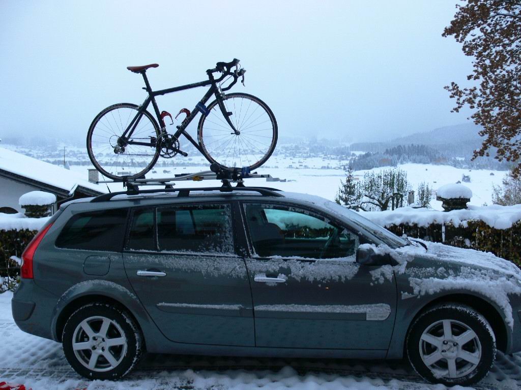 Das Bild im Schnee entstand kurz vor der Abreise nach Leipzig. Über Nacht gab es 20 cm Neuschnee; mit dem Rad auf dem Dach erntete ich schon einige ungläuige Blicke - ist ja auch ein eher unpassendes Sportgerät für die Witterungsbedingungen. Ein paar Tage früher sah es noch ganz anders aus. Spätsommer, goldener Oktober, Sonnenschein, T-shirt-Wetter, 100 km Fernsicht - also ideale äußere Umstände für eine Abschlussfahrt.