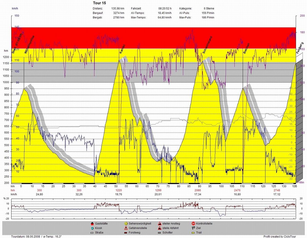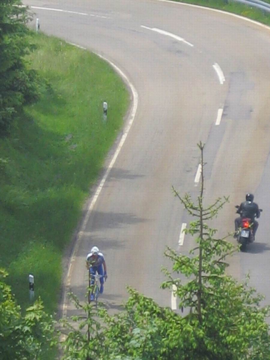 = ich bin gewarnt worden vor diesem Schwarzwälder Hügel, aber der tat so richtig weh. So etwas bin ich noch nie gefahren, allerdings Schauinsland- und Feldberg-Niveau auch nicht.Diese furchtbaren 14km mit mindestens 7 % Steigung und dann zwei Rampen mit 10-14%. Barus Edge, den ich bekommen habe, zeigte zeitweise 20% an. Da mußte ich ihn abdecken, denn da wurde mir schlecht, nicht gut für die Moral. Oben angekommen, kam ich schnell zu mir, denn ich motzte wie ein Rohrspatz über diesen Berg. Ich wurde beruhigt mit den Worten. DAS WAR DER SCHWERSTE! Wieso ich immer so gutgläubig bin!?