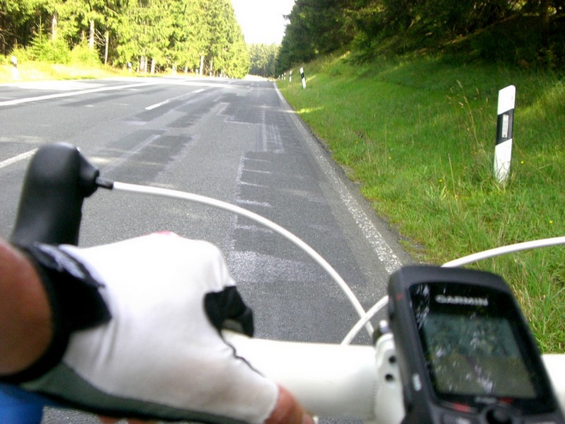Der Streckenabschnitt von Braunlage nach Oderbrück ist nach 115km absolvierten km das schlimmste, was einem so passieren kann. Durchgängig nicht unter 7%, Gegenwind, knapp an uns vorbeifahrende Autos und v.a. Motorräder und dann eine zweispurige Strasse als finalen Anstieg. An der Geschwindigkeitskurve sieht man, so glaube ich, sehr deutlich, wann der Krampf aus dem Oberschenkel nicht mehr zu lösen war und ich den Rest mit 34/27 im Stehen gefahren bin. Im Sitzen sah die Innenmuskulatur nicht lecker aus und der Huckel des zusammengezogenen Muskels im Oberschenkel ließ auf die „weisse Fahne“ meiner Muskulatur schließen. Manfred hinter mir, Falcon gar nicht mehr zu sehen...so kam ich am Königskrug an. Falcon stürzte dann aus dem Schatten einer Tanne heraus und wir fuhren langsam weiter und warteten so auf Manfred, der uns dann auch schnell einholte.