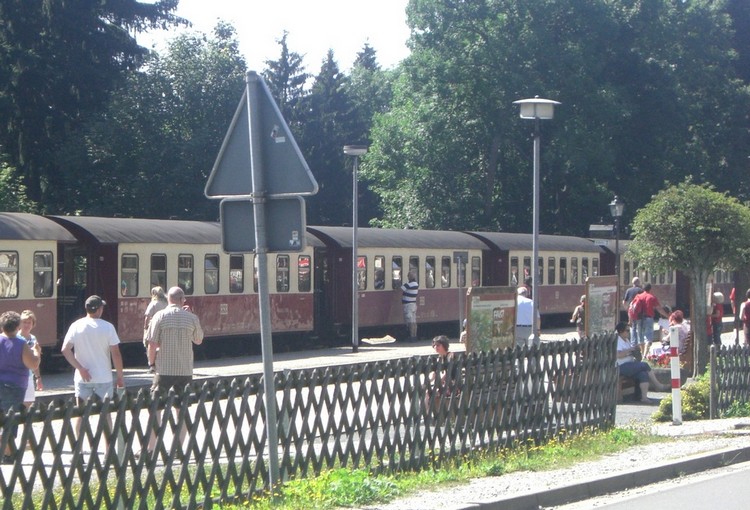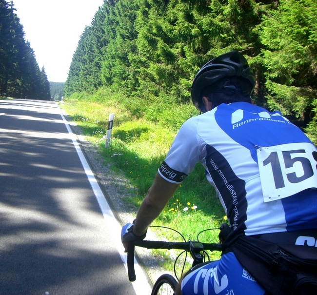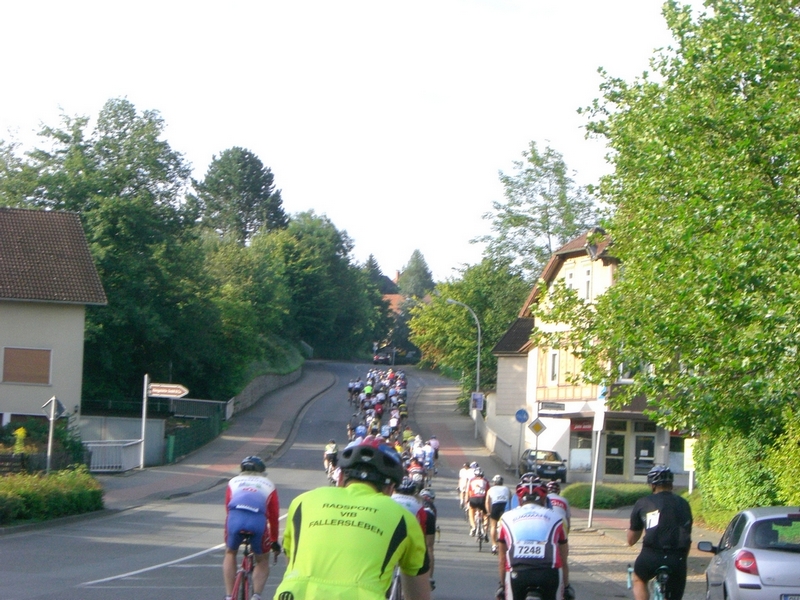 Nur noch 30km bergauf und dann noch 70km bergab bzw. gerade. So redete ich mir den nächsten Streckenabschnitt schön. Unsere Gruppe fuhr los, als ich noch nicht alles beisammen hatte. Falcon grinste und schlug ein eins zu eins vor, da ich nun die Gruppe verpasst hätte. Dafür hat er auf mich geartet und das war überlebenswichtig, dass ich ein VR bekam, das ich anvisieren konnte. Wir fuhren an der Harzer Schmalspurbahn vorbei. Die kannte Falcon noch nicht und ich konnte ein wenig angeben mit meinem Fachwissen. Egal, 2 Fotos geschossen während der Fahrt, Konzentration auf das Wesentliche. Die erste Spitze bei Elend tat schon höllisch weh in den Beinen, dafür war der Asphalt auch noch sehr sehr ruppig auf der Abfahrt. Nach Braunlage schleppte ich mich mit Falcon und 4 anderen Fahrern, darunter Manfred aus Celle, die zwei widerlichen Zinken hoch. Bergab konnte man nach Braunlage nicht toll reinfahren, da uns 10 Cabrios mit Anfang drreißigjährigen Jungs überholten, die sich gegenseitig fotografierten, wie geil sie doch in ihren Kisten sitzen bzw. aussehen. Jedenfalls haben diese Autos die Ampelkreuzung in der Stadtmitte dermaßen zugemacht, dass ich hinter der Eissporthalle einfach abgebogen bin. Falcon folgte mir, aber die anderen trauten sich meiner Ortskenntnisse nicht anzuschließen. Ok, ich konnte auch nicht ahnen, dass hinter der Eishalle die Strasse gesperrt war. Aber als Kenner der Stadt wusste ich noch einen Geheimweg (Fußgängerbrücke), die uns wieder auf die Strasse nach Oderbrück brachte.
