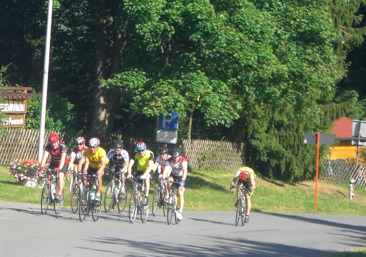 Wir erreichten Hohegeiß, eines der schönsten Dörfer im Hochharz. Ich sinnierte ein wenig dahin, unterhielt mich , so glaube ich mit einem Celler, als es plötzlich laut knallte: W:I:N:N:N:I schallte es durch meinen Kopf. Hat er es geschafft und hat seinen Schlauchreifen durchstochen? Ich rief verzweifelt nach hinten, aber die Antwort blieb aus. Ich ließ mich zurückfallen und dann überholte mich ein Mann laut fluchend mit einem schmatzenden HR. Knapp dahinter radelte lächelnd der Winni und meinte, dass bei ihm alle ok wäre und warum ich das halbe Dorf zusammenschreie. Ich freute mich, dass es ihn nicht erwischt hat.
