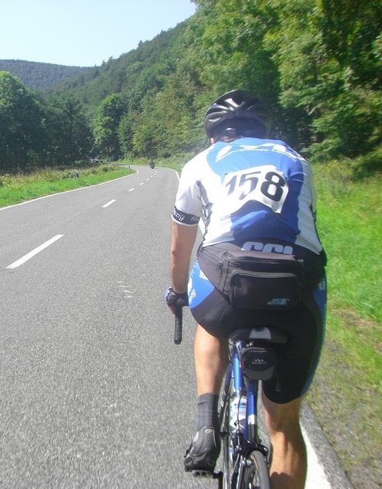 Nun kam noch der Sonnenberg und auch wenn es nur 100hm sind, so doll tun die im besten Gegenwind und bei gleißender Hitze weh. Bei den am Berg gefahrenen Geschwindigkeiten wollen die hm ja auch überhaupt nicht aufhören..... Manfred bemerkte plötzlich, dass meine Satteltasche auf wäre. Also hielt ich Hornochse im Berg an, um sie zu schließen. Mein Trüppchen war also weg und ich konnte wieder allein mit meinem neuem Freund Krampf, den Sonnenberg erklimmen.