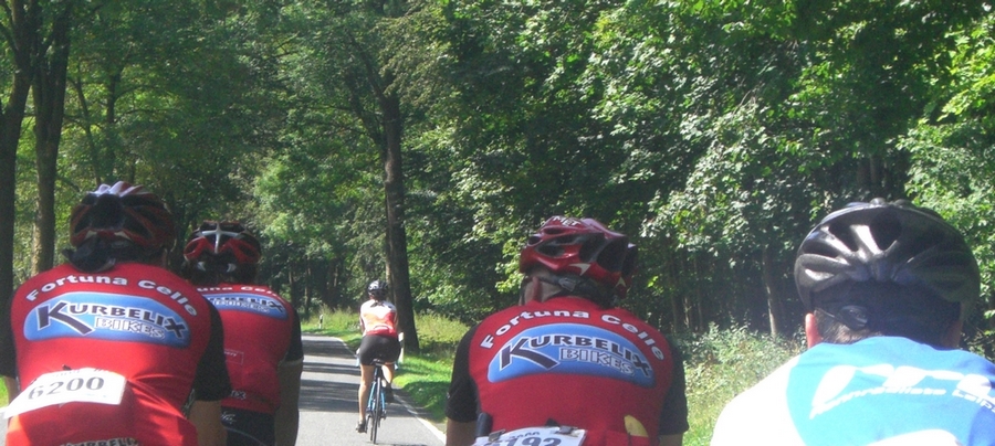 Mit 4 Cellern und Falcon und mir wurde blackdevil bis zur Abbiegung in Herzberg nach Bad Lauterberg für die 120km Fahrer begleitet. 145km hatten wir geschafft, nun kam der weniger spektakuläre Teil: 55km im Flachen, aber zu Beginn gnadenlos dem starken gegenwind ausgeliefert. Zu meiner Beruhigung hat sich mein Oberschenkel wieder frei gestrampelt. Vorne fuhren zwei Celler, die einfach nicht genug haben wollten/ konnten mit bis zu 36km/ gegen den Wind. Als wir dann in den Kantenwind bei Wulften abbogen, gab es aber das erste Opfer und einer unserer Sechser-Gang ließ abreißen. Auch bei rückenwind waren wir nun alle – auch aufgrund der heißen Temperaturen – doch darauf bedacht, zusammen das Ziel zu erreichen.