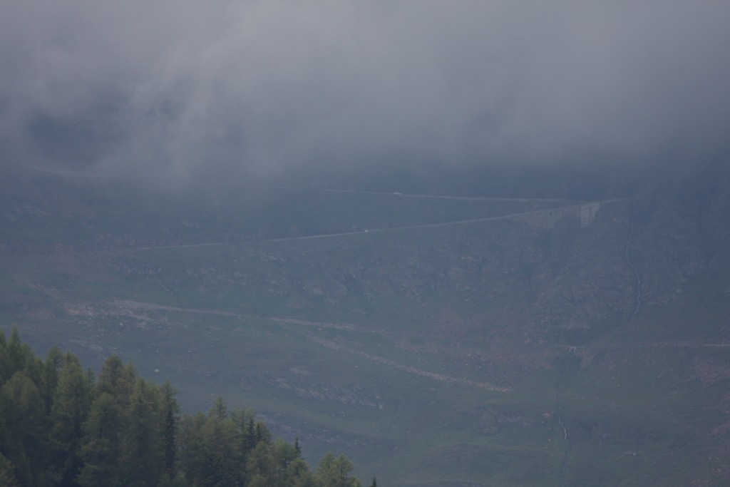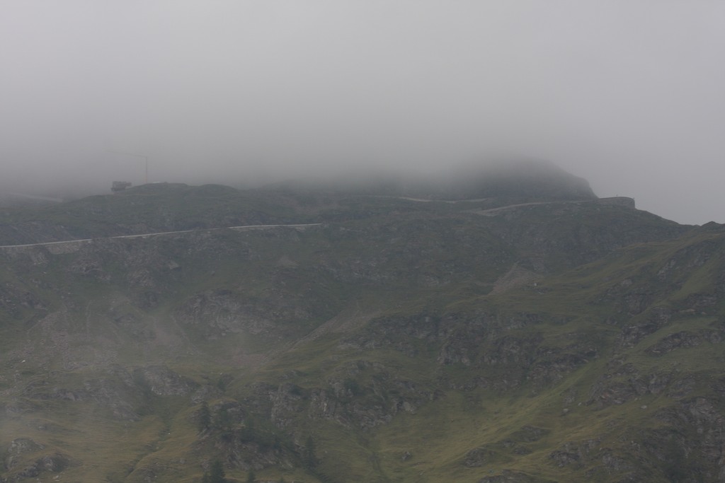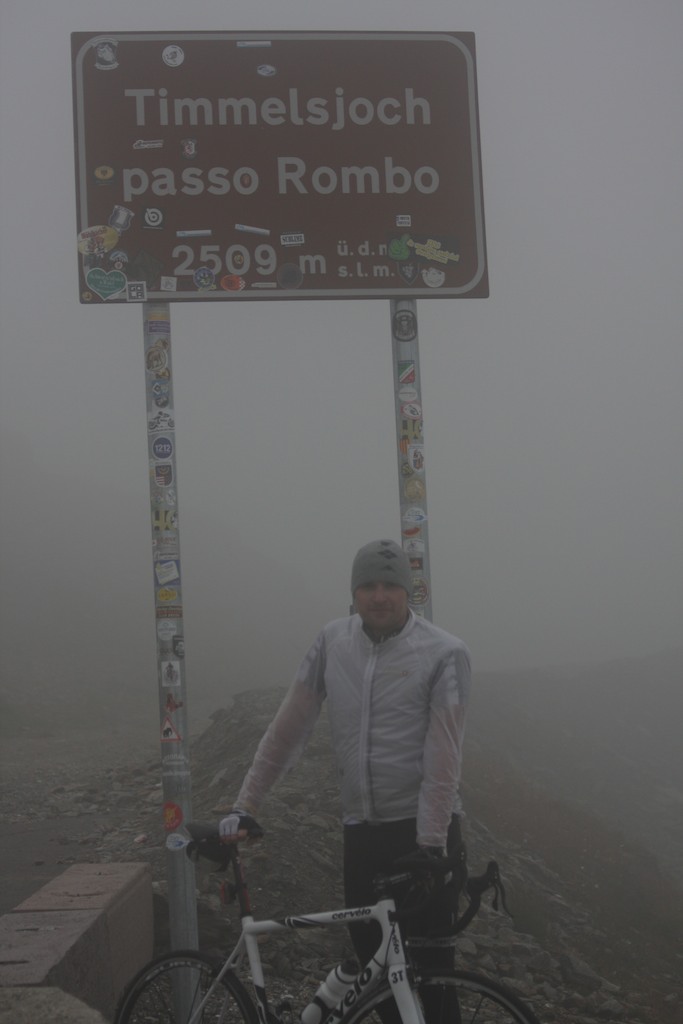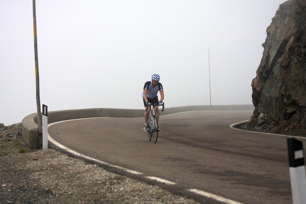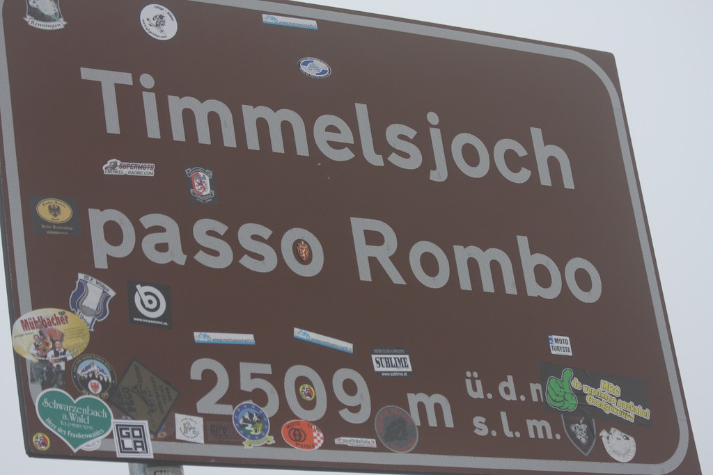 Ich rechne, vielleicht noch zwei Kilometer. Die Strasse geht nach links und plötzlich ist stock duster. Ich bin ich im Tunnel. Gut, das ist nicht der Erste im Anstieg, aber auf jeden Fall der längste und dunkelste. Nach ein paar Metern muss ich stoppen. Ich sehe gar nix mehr, taste mich fast zum Strassenrand. Ja, ich wusste von den Tunneln, doch beim Aufbruch habe ich vergessen die Lampe zu montieren. Zum Glück taucht hinter mir meine Schwester auf. Also mache ich es wie die Profis. Lasse das Begleitfahrzeug die Strasse ausleuchten. So geht es immer zügiger weiter. Zügig deshalb, weil es nun fast schon flach ist. Zumindest im Vergleich zu den letzten Kilometern. Jetzt hält mich nichts mehr. Ich beschleunige und die Anzeige im Garmin erreicht schon fast vergessen Werte. Dann die letzte Kurve und ich sehe es: Das Paßschild. Der Jubel fällt kurz aus. Kein Panorama, nur Nebel, Regen, Kälte. Diese Paßhöhe ist definitiv die ungemütlichste, die ich je erlebt habe. Ich schlüpfe in wärmere Kleidung, wir machen die Beweisfotos und dann folgt das, was zwei von Sölden hoch kommende Radler so kommentieren: „Was? Du fährst nicht runter? Krankenkasse, oder was?“