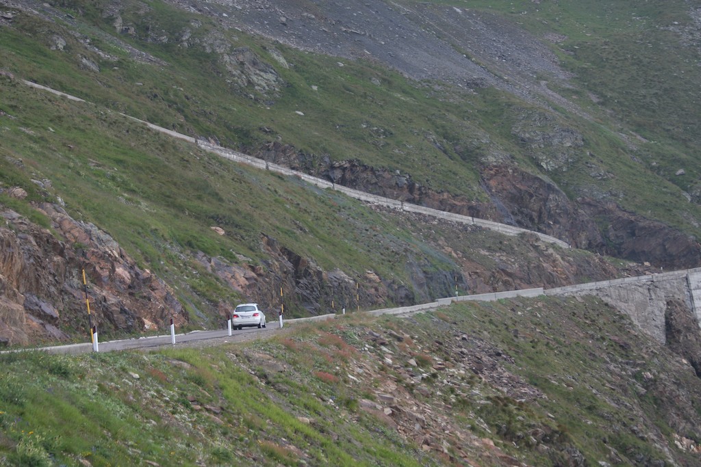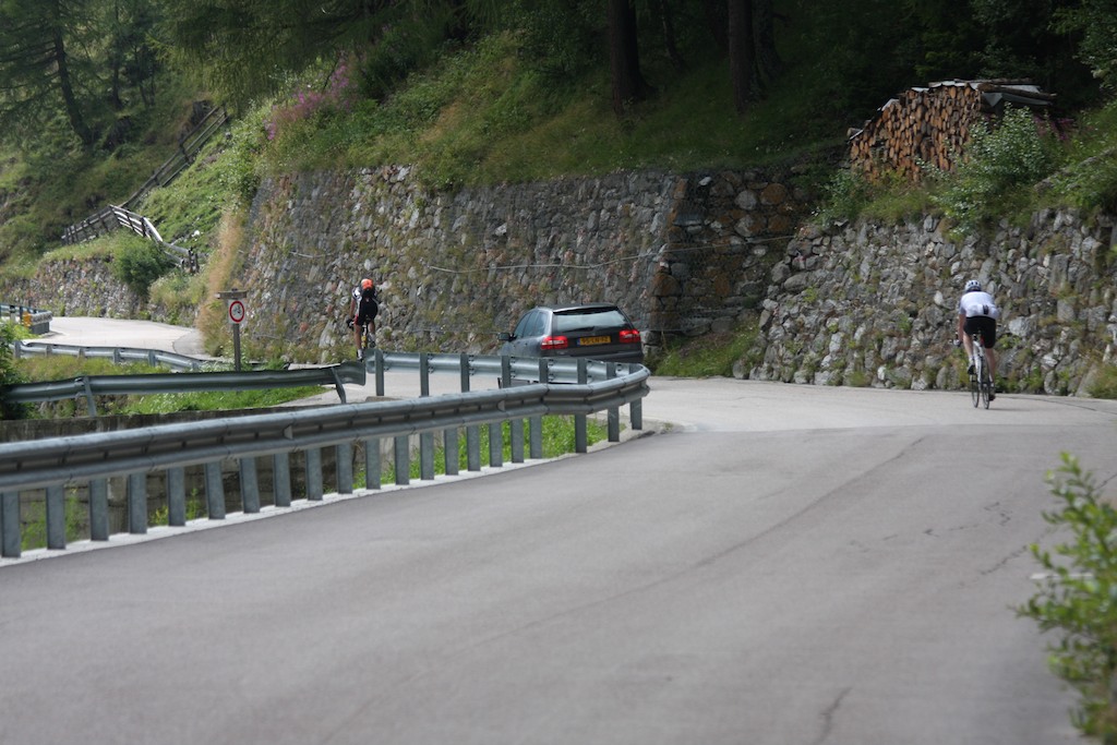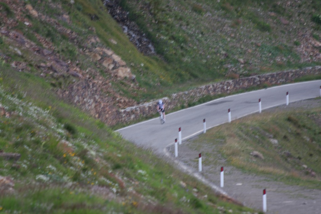 Meine Schwester begleitet mich das erste Mal auf einen Berg. Vielleicht erklärt das den sorgenvollen Blick. Die Frage, ob ich weiter fahren will, stellt sie mir aber nicht. Ich hätte eh bejaht. Fünf Minuten habe ich durchgepustet, nun will ich weiter. Die 5 - 6 Prozent auf den nächsten Metern lassen mich Mut schöpfen und ich sage mir: Nächste Pause in zehn Kilometern, dann mit Schwung in die letzten Kehren. Vor mir taucht ein Mitstreiter auf. Mit Rucksack. Als ich ihn erreiche kommen wir ins Gespräch und meine erste Skepsis nachdem ich seine unrasierten Beine gesehen hatte, weicht tiefem Respekt. Er ist mit seinem Bruder unterwegs. Seit acht Tagen schon. Jeden Tag eine Etappe. Im Allgäu sind sie gestartet, es geht durch die Alpen. Gestern das Stilfser, heute das Timmelsjoch. Immer mit 9 Kilo Gepäck dabei. Schon dass ist beeindruckend. Als er mir dann aber auch noch erzählt, dass sie erst seit März Rennrad fahren, bin ich endgültig beeindruckt. Allerdings fahren sie in zwei unterschiedlichen Klassen. Der Bruder hat fast 30 Kilogramm Übergewicht, fährt mit Sandalen (sein Erstes Mal mit Klickpedalen endete in einen bösen Sturz, danach wollte er nicht mehr) und hat vorher sehr lange keinen Sport gemacht. Er fährt weit hinter uns sein eigenes Rennen.