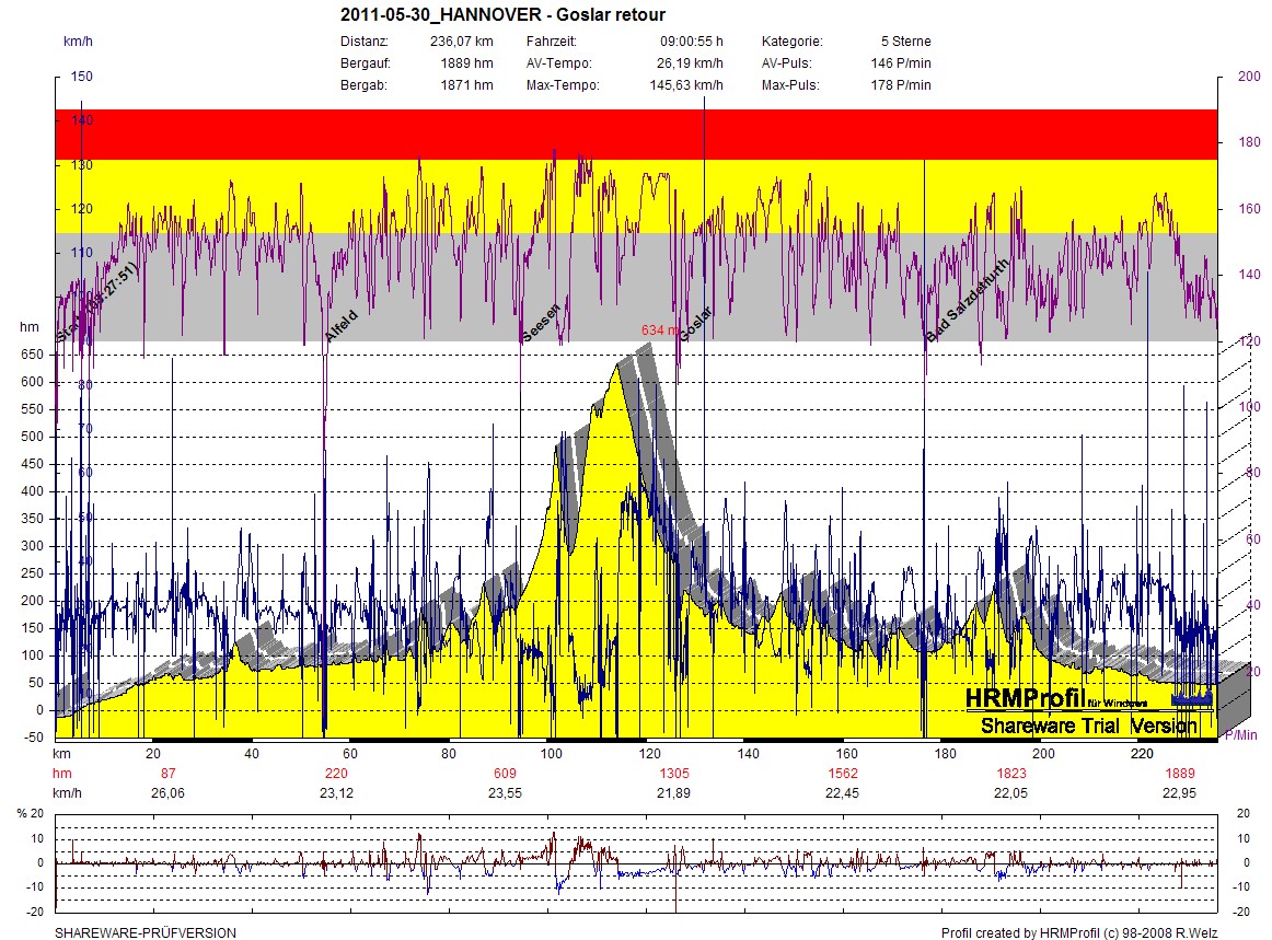 Der letzte Ausflug vor dem urlaub.... und ich wollte ihn allein erleben. morgens nach 6 Stullen mit Honig, Nutella und Harzer Käse ging es auf die Reise. Es war 0830 und bis Alfeld wurde es mal so richtig warm und ich musste beide Flaschen komplett neu füllen. Bei km 75 zog es mich nicht nur aus dem Leinetal, sondern auch fast vom Rad. Ein widerlicher Stich, der ganz Muldentaltauglich erschien, machten mir inkl. gegenwind, Sonne von vorn und seinen 14% höllisch zu schaffen. Da waren die Anstiege der B65 echt ein Kinderspiel. In Seesen wurden wieder beide Flaschen gefüllt und das 500hm Schild bekam ich nach dem 1. Berg zu fassen. Eine Bremse hat meinen Oberschenkel dabei angenagt :augenreib: . Durch das wunderschöne Lauthental ging es über den Bielstein hoch nach Hahnenklee....Ein wunderbarer Anstieg, der mir aber letzte Wassertropfen raubte, so dass ich am Auerhahnteich nachschöpfte. Munter schnell ging es runter nach Goslar, wo das Mittagessen nebst Familie schon mehr als 40 minuten über verabredeter Zeit auf mich wartete. So konnte ich auch nur kurz meine familie über alle Sorgen und Freuden unterhalten und warf mich nach Dusche und Trocknung der Klamotten etwas weniger freudig auf Blue Endorfin, wie am Morgen.