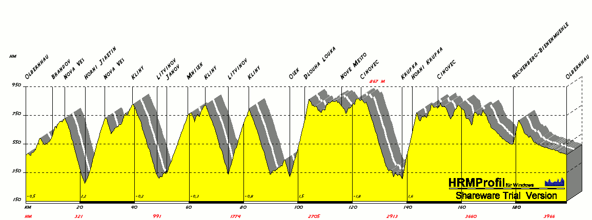Im Tal dann bis Janov und die zahlreichen Serpentinen hoch nach Mnisek. Kein wirklich schwerer Anstieg, die Steigungsprozente bleiben meist einstellig und der Wald gibt Schatten. Natürlich mußten wir die erwähnte Abfahrt Kliny-Litvinov auch von der anderen Seite bewundern, ließen uns deshalb etwas mehr Zeit und fuhren hinauf. Jetzt begann es langsam etwas zu zwicken in den strapazierten Oberschenkeln, ein unglücklicher Gegenwind kam auch noch hinzu und das ungerührte Pokerface bei Puls 175 funktionierte noch bei allen Beteiligten.