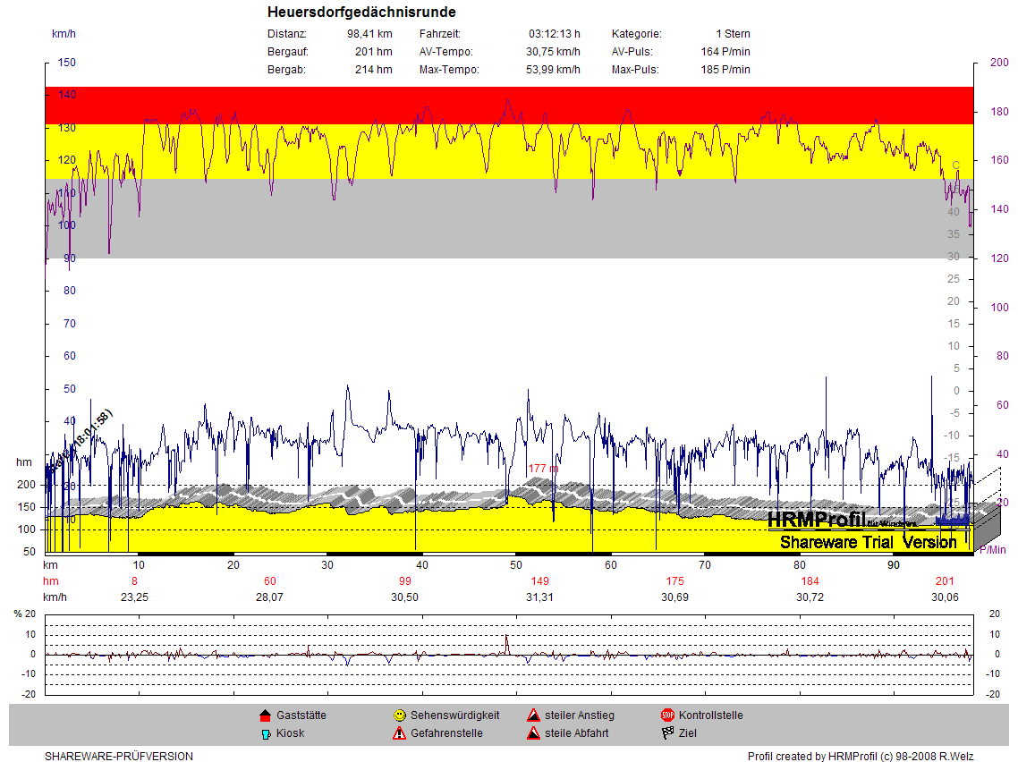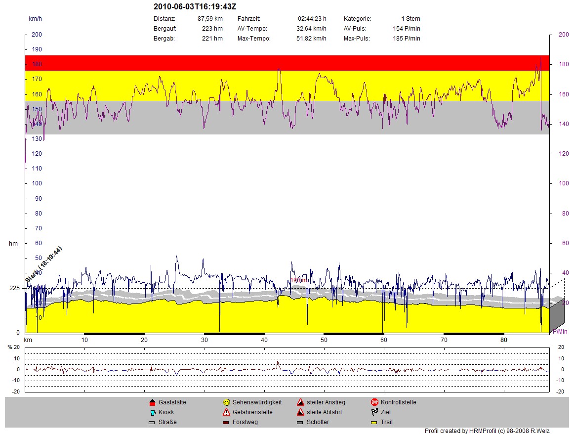 Aus Floeris HRM-Abbild geht leider gar nicht die eigentliche Geschwindigkeit hervor, mit der im Feld eigentlich ganz locker fluffig pedaliert wurde, daher stell ich meins mal noch mit ein. Und das trotz einiger Wegfindungsschwierigkeiten, bei denen sich die Zweierreihe das eine oder andere mal an Kreuzungen komplett geteilt hat und erst mühsam wieder zusammengebracht werden musste.