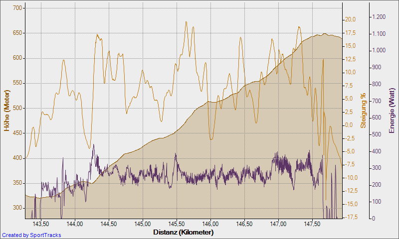 schau dir mal die letzte welle, ich hoffe du findest sie, ~240W für die Welle, das war Anschlag, bis dann die Riegel auf mich geworfen wurden. der von Sippe, mit dem schon verputzten von Peso, und schon geht es aufwärts - war total begeistert, und das hat bis zum ziel nicht aufgehört. Es gab sogar noch einen kleinen Sprint gegen Vantage, der ganz knapp ausging