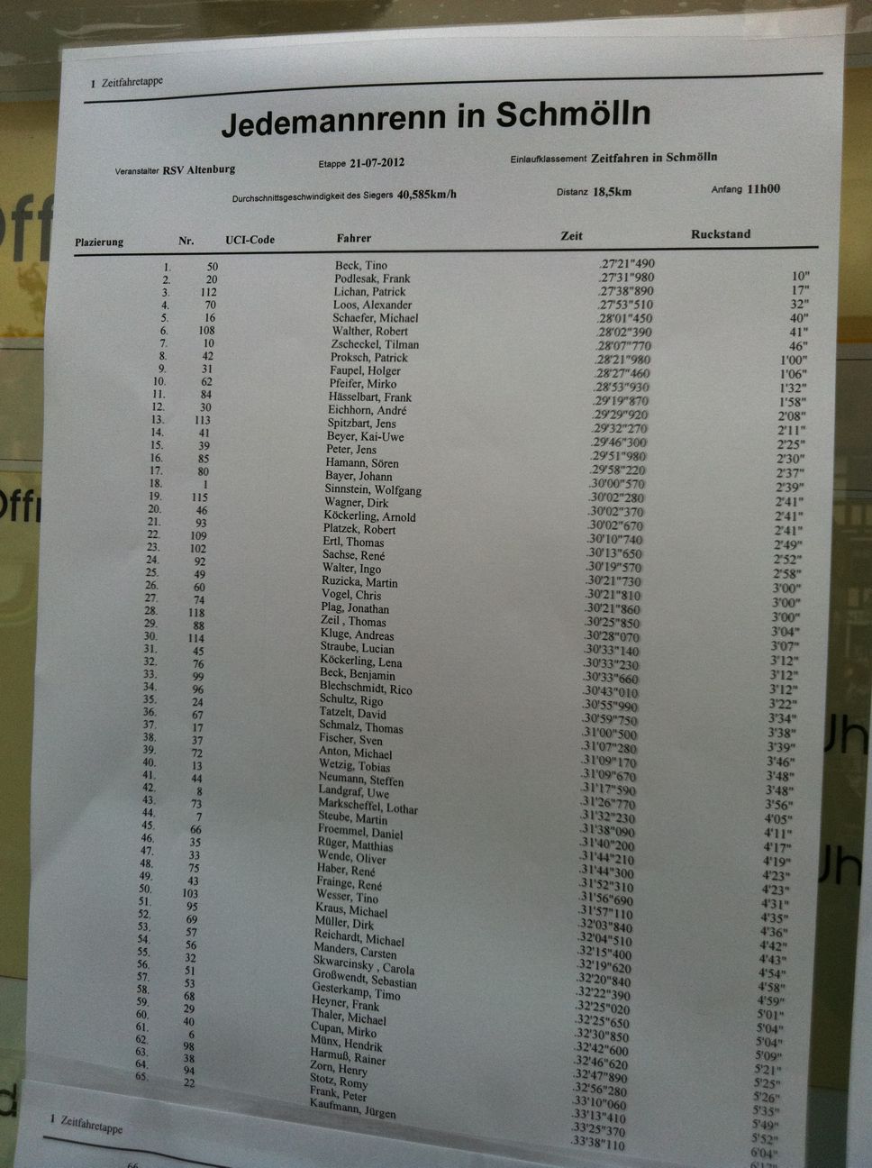 Da ich kein Zeitfahrtyp bin staune ich immer wieder über solche Ergebnisse und studiere diese respektvoll. Man kann daraus auch wichtige Infos für die Strassenrennen/Kriterien ziehen! Denn wenn so ein Fahrer im Wettkampf weg fahren will muß man aufpassen und möglichst sofort reagieren.