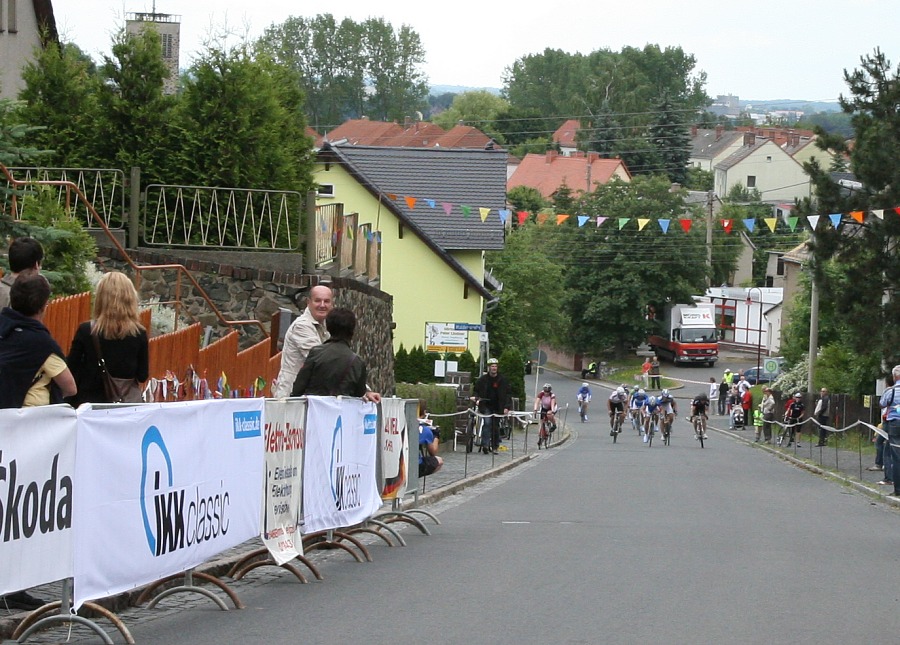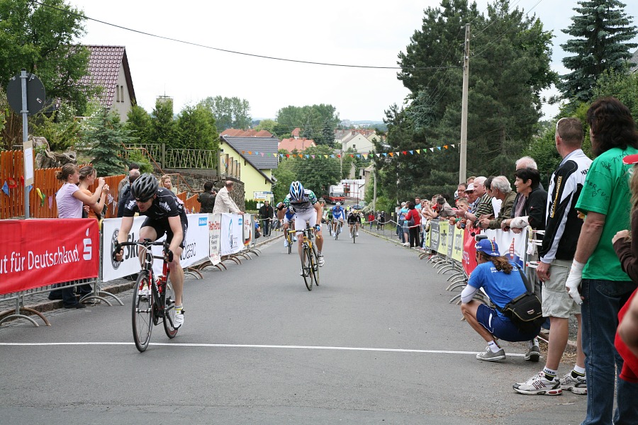 Hinab nach Bahren wieder gleiches Spiel von meiner Seite mit Einfahrt in die Kohlenstrasse von der Spitze. Diesmal kam es zwar nicht zu ruckartigen Attacken, aber dennoch setzte sich vorn ein Pärchen ab, Charlie liess schnaufend eine Lücke reissen und ich dachte, er sei am Ende und setze mich oben vor ihn. Hier ruft mir Charlie allerdings zu, dass Heiko im Führungsduo dabei ist, also wurde die Sache nun deutlich kontrollierter. Etwas Übersicht verschaffend wurde mir erst jetzt klar: wir hatten es also geschafft, mit gleich vier Fahrern im 12er-Spitzenfeld zu liegen, das ergab nun alle Optionen, die wir uns gewünscht hatten! Was nun folgte, war ein konsequentes Ausnutzen unserer starken Position: nach der Schloßstrassenabfahrt griff Charlie an und ich konnte hinter ihm die Lücke öffnen lassen. Kurz vor Grimma wurde klar, dass Heiko aus dem Führungsduo zurückgefallen war und auch Charlie kam weder ganz an ihn ran, noch von uns weg. Also entschied ich, einen ruckartigen Nachsetzversuch zu wagen, dem glücklicherweise niemand folgen wollte oder konnte. Peso musste sich nun hinten alleine um die Lücke kümmern. Am unteren Teil des Hohnstädter liefen dann Charlie und ich auf Heiko auf, vor uns nur ein Einzelfahrer und hinter uns ein Loch von ca. 150 Metern. So kamen wir im Dreierpack durch die zweite Zieldurchfahrt und hatten nur einen Einzelfahrer vor uns. Könnten wir die Sache in Form eines "Teamzeitfahrens" packen?