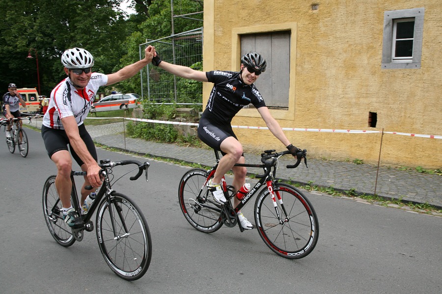 Charlie zog vorn und zog und zog ... , ich war aber vom Hohnstädter noch so in Sauerstoff-Schuld, dass ich ihm nicht die so sehr erhoffte Hilfe sein konnte, denn meine Lungen flogen auch dann noch, als schon die Verfolger wieder auf uns aufliefen. Also musste nun die ursprünglich zurechtgelegte Taktik mit Peso als Siegkandidaten auf den Plan: beim letzten Kohlenstraßen-Anstieg führte Charlie von vorn fahrend Peso hin zum steilen Teil, wo diesmal nun Pesos Chance kam, da auch vorn der einsame Spitzenfahrer wieder ins Visier gekommen war: Peso also schnell vorn weg, Charlie und ich öffneten wieder das Loch und sahen, dass peso in kürzester Zeit zum Spitzenfahrer aufgeschlossen hatte. Nun konnten wir wieder locker lassen, wobei allerdings ein starker Abfahrer vor mir halsbrecherisch die Schloßstraße hinabschoss und nach der Einmündung in die Muldentalstraße nochmal richtig lospfefferte. Wenn er auf peso auflaufen würde, dann hätte sich das Kräfteverhältnis vorn zu unseren Ungunsten verändert. Also in den fauchenden Körper nochmal 20-30 richtig harte Tritte hineinsetzen, um mit über 50 Sachen an leichter Gegensteigung den Kerl wieder einzufangen. Er wollte wechseln, aber wir hatten ja unser Eisen vorn - also ruhig bleiben und alles bestens. Tempoverschärfungen weiterer Fahrer gab es nun reichlich, wir mussten sie nur mitgehen, aber nicht verlängern. Leider aber entfernte sich durch die zahlreichen Attacken anderer Fahrer das Duo vorn mit Peso nicht von unserer Gruppe und so kam es dann, dass wir an der Muldentalbrücke zu Beginn des Finales am Hohnstädter wieder aufeinander aufliefen. Die Karten waren also neu gemischt, wobei unser Vorteil blieb, dass die anderen schon richtig viel opfern mussten. Ein Fahrer zog sofort im flacheren Teil mittelscharf an. Ich hinterher, Heiko ebenfalls. So kammen wir über ca. die Hälfte des flacherern Teils, hinter uns bereits einige Lücken. Irgendwann erreichten wir die Nähe meines anvisierten Sprintpunktes und ich hoffte, wenigstens noch für Heiko bis zum steilen Zielhuspel hin den Sprint anziehen zu können. Meine Lunge flog leider schon vor dem Sprintversuch, aber hinter uns waren immer noch ca. 50 Meter offen, so dass ich es dennoch versuchte. Ich kam zwar zunächst gut weiter weg und fuhr auch immer noch in Führung liegend in die Abzweigung zur Schlussrampe ein. Dort aber war mein Pulver verschossen. Konnte Heiko mir folgen und es nun machen? Nein, da kam kein Heiko an mir vorbei, sondern es flog von hinten die Meute heran und drei Fahrer überholten mich zu Beginn des steilen Schlußteils Seit-an-Seit, darunter Charlie! Was nun kam, war der echte Wahnsinn, denn Charlie hatte noch die meisten Körner und riss zu Beginn des steilen Teils so brutal an, dass nur noch ein einziger Fahrer ihm folgen konnte und sich danach schnell eine Lücke von ca. 20 Metern auftat. Tatsächlich konnte er das Ding bis zum Zielstrich blitzsauber durchziehen, es wurde also wahr: wir konnten die RuM-Hobbyklasse für uns verbuchen! Ich kam dann durchgereichterweise als 7-ter durch, was mit meinen Hoffnungen, a) die Spitzengruppe halten zu können und b) einstellig zu finishen komplett d´accord ging.