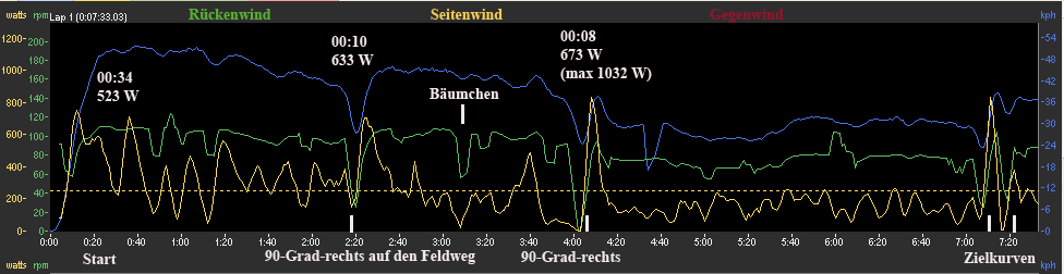 Nach dem Start der gewohnte Sturm freigelassener Hornochsen mit > 500 W in der ersten halben Minute. Ab ca. 01:20 fährt man aus dem Wald heraus und bekommt schon ordentlich Wind von der Seite. In der ersten Runde leistet Boris hier 341 W für eine Minute, weil er sich auf der falschen Seite des Feldes bewegt. Dann die scharfe Rechtskurve auf einen schmalen Pfad, der sich bei 03:00 um einen Weißdornbusch windet - man sieht, wie Trittfrequenz und entsprechend auch die Leistung kurzzeitig sinken, weil so eine Kamelherde eben nicht in einem Rutsch durch das Nadelöhr paßt.