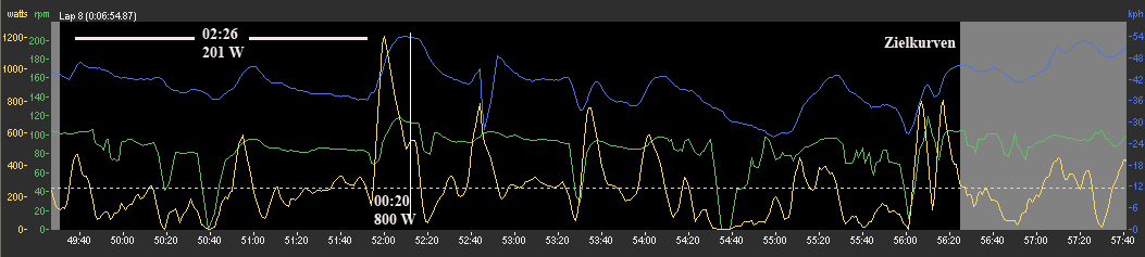 Die Runde beginnt mit 200 W über die ersten 2,5 Minuten reichlich angenehm. Nach der ersten Rechtskurve sieht sich Boris plötzlich an der Spitze des Feldes und beschließt, mal zu schauen, was die Herren hinter ihm so drauf haben. Erst einmal 20 Sekunden mit 800 W beschleunigen ihn auf deutlich über 50 km/h und der Blick nach hinten verrät lediglich ein Univegahemdchen am Hinterrad. Boris ärgert ihn noch ein bißchen, läßt sich dann aber wieder zurückfallen. Deutlich ausgeprägt in dieser Runde auch die Hatz um die Zielkurven.