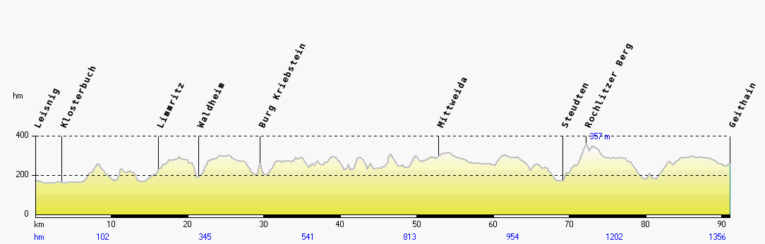 Heute mit bejar und der Bahn bis Leisnig und dann in die Täler (und auf die "Höhen") von Zschopau und Mulde. Dabei natürlich auch einen Abstecher zur Burg Kriebstein gemacht - 22%. In Mittweida habe ich mir kurz die Uni meines Vaters angesehen (und die Stammkneipe :) ) und dann ging es ab Geithain mit der Bahn zurück nach Leipzig.