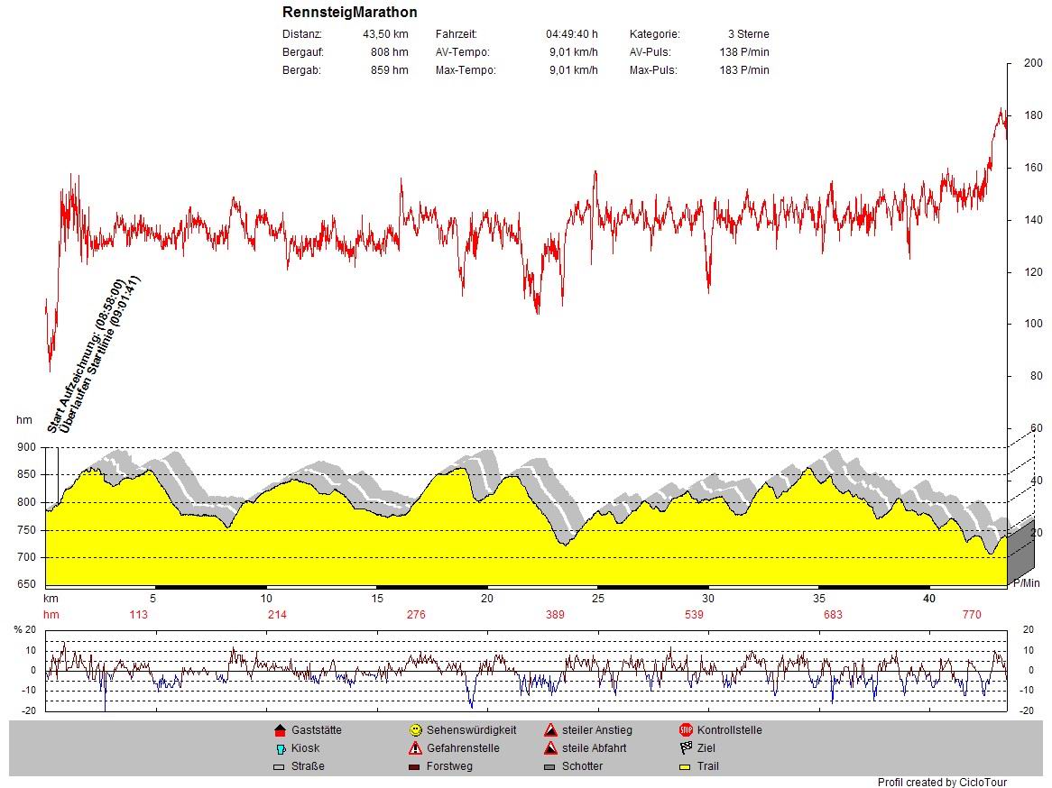 Das Feld der 3007 Marathonis macht sich auf den Weg nach Schmiedefeld, begleitet vom Lärm unzähliger Rasseln, Tröten sowie klatschender Hände. 527 weibliche Teilnehmer und 2480 männliche Teilnehmer haben sich in diesem Jahr für die zweitlängste Laufstrecke angemeldet. Die Strecke war erwartungsgemäß ziemlich schlammig (einige Waden hätte ich eher Sus scrofa denn Homo sapiens zugeordet) aber nichtsdestotrotz auf den ersten 20 Kilometern mit einem relativ hohen Tempo zu bewältigen. Relativ hoch? Nun, mit einer Zwischenzeit von 1:39 h nach den ersten 20 Kilometern war ich vollkommen zufrieden und begann sofort damit, mir in Gedanken meine "Traum-Endzeit" auszumalen.