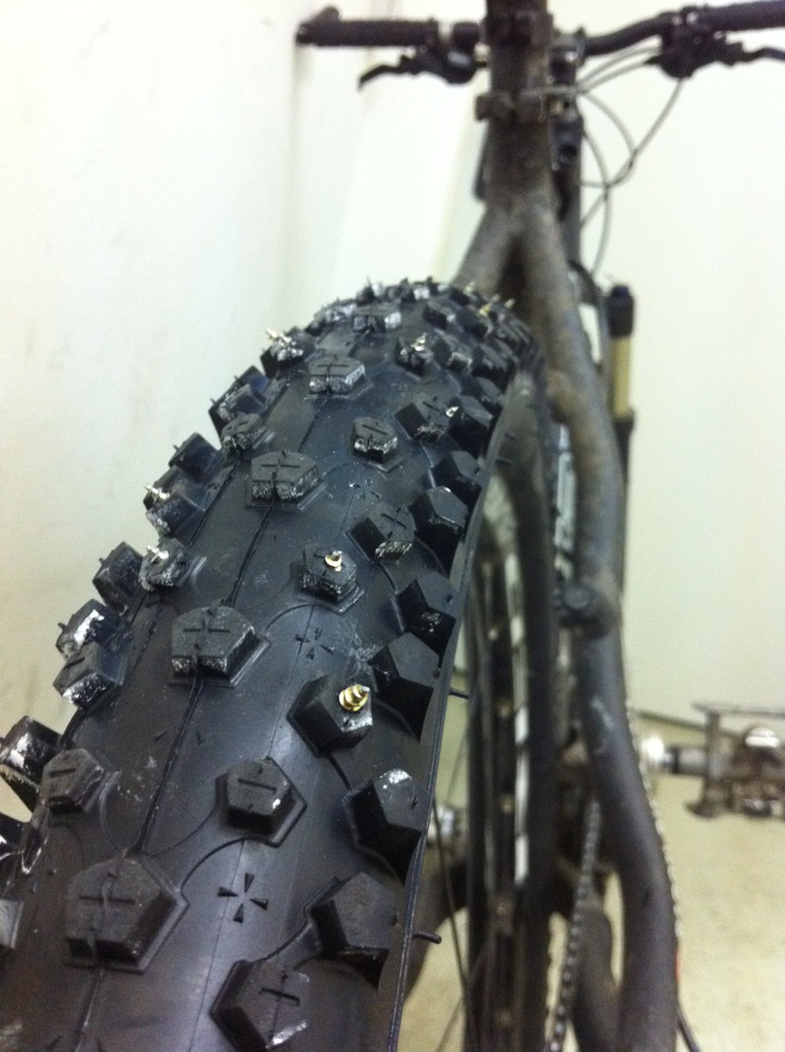 ich habs mal probiert,einen spike reifen für den winter selber zu bauen,und bin mit dem ergebnis zufrieden und es funktioniert.ich hab mir 2 alte gebrauchte reifen in einem fahrradladen besorgt.dann habe ich aus dem baumarkt,dachnägel gekauft,mit einem flachem kopf und 2,5 cm länge.die habe ich dann durch den mantel gebort.den anderen mantel habe ich auf den seiten aufgeschnitten und die seitenwände entfernt.den belag/profil habe ich dann auf die nägel,köpfe gelegt,damit der schlauch nicht von den nägeln beschädigt wird.