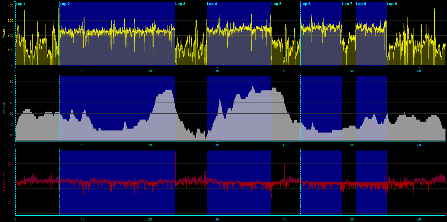 Unterschwellig (L2-L3) misst der P2M über Jahre hinweg eine leichte Tendenz zur Linksverlagerung (52/48) wobei es auch sein kann dass ich da rechts mehr ziehe anstatt links mehr zu drücken. Wenn es da in den Hungerast hineingeht bleibt es bei dieser Verteilung.