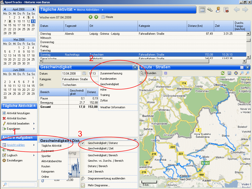 Wie erstellt man denn bei Sport Tracks vernünftige Diagramme. Hätte gern auf der X-achse die km und auf der y-achse geschwindigkeit, HF, Höhenmeter usw.
