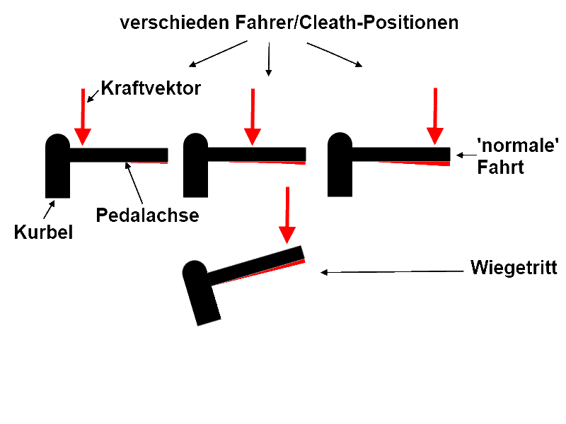 Wenn man in den Wiegetritt geht, wirkt die Kraft erstens nicht mehr orthogonal auf die Achse und zweitens verschiebt sich der Bezugspunkt wieder nach außen.