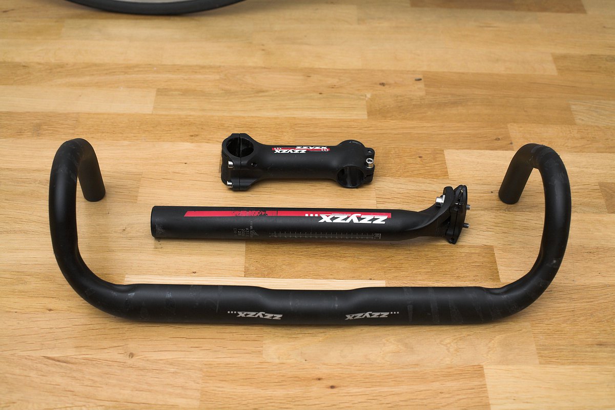 Anbauteile: Vorbaulänge 120 mm; Vorbauneigung 7° (nicht die extremen -17° wie im Bild des Gesamtrades!); Lenkerbreite: 44 cm; Lenker ist Alu in aero-Profilierung; Sattelstützendurchmesser ist 31,8 mm, die Sattelstütze ist ungekürzt 300 mm.