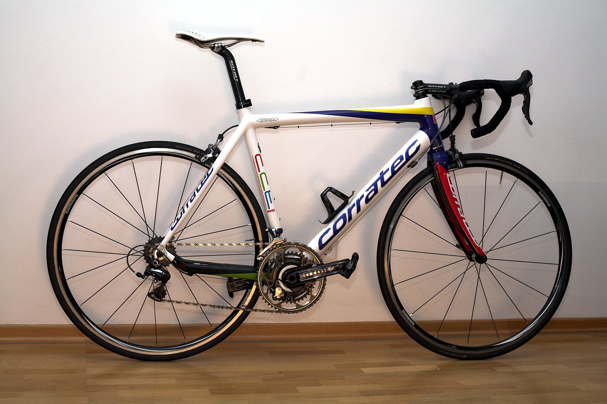 da ein neues Teamrad ins Haus steht, muss das Corratec CCT Pro multicolor-Carbonrad nun weichen. Es hat mich seit 2012 begleitet (siehe: http://forum.rennradliste-streckendaten ... #p23243523), war nur im Jahr 2012 im Renneinsatz (mit so einigen Erfolgen u.a. der "inoffiziellen WM" - und zum Glück keinem Sturz!). Mit Einzug des ersten Teamrades 2013 wurde das Corratec noch im Training gefahren. Der Rahmen hat eine hohe Steifigkeit in Lenkkopf und Tretlagerbereich und fährt sich daher sehr gutmütig. Der Rahmen passt für Fahrer im Größenbereich 1,78-1,88 m; bei kurzem Oberkörper sogar bis ca. 1,92 m (Geometriedaten s.u.). Probefahren ist möglich, da das Rad noch aufgebaut ist.