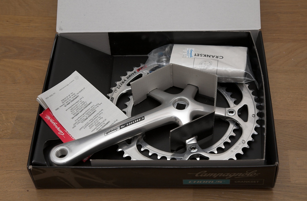 Für die Alu-italo-NOS-Fans hier ein neuer und nie verbauter Chorus 172,5 mm-Kurbelsatz (10-fach Kettenblätter in 52:39) mit Kurbelschrauben. Dabei alle Papiere und die OVP. Der Kurbelsatz ist für Campa-Vierkantinnenlager mit 102 mm Achslänge.