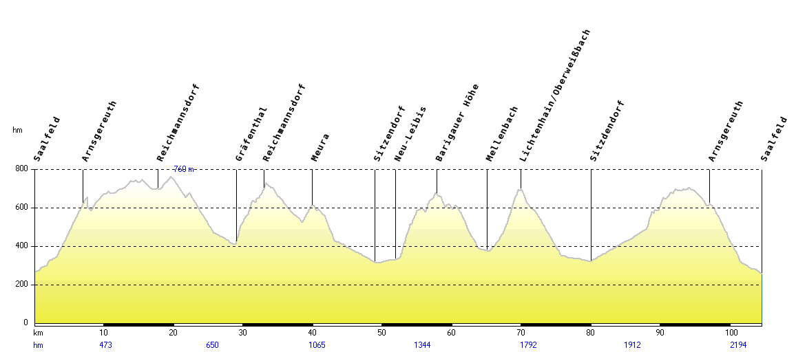 Von Saalfeld aus hoch nach Arnsgereuth, hügelig über die ehemaligen Goldgräbersiedlungen Reichmannsdorf und Schmiedefeld und schließlich wieder hinab nach Gräfenthal. Dort wartet der bösartig bepflasterte Anstieg, der uns wieder nach Reichmannsdorf bringt. Über Meura ging es dann ins Schwarzatal mit mehreren Optionen zum Aufstieg. Wir entschieden uns für schwierigste Variante und fuhren erst von Neu-Leibis zur Barigauer Höhe und dann von Mellenbach aus die schwere Seite nach Oberweißbach. Von Sitzendorf aus dann die letzten 400 hm über Wittgendorf nach Arnsgereuth - hier hat mancher schon mal ein gutes Motiv für die Welthungerhilfe abgegeben.