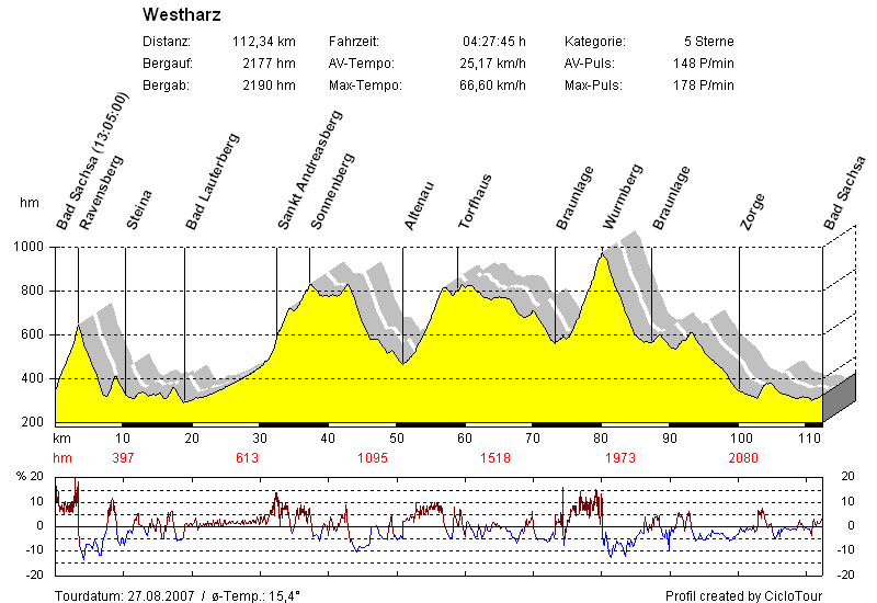 Die vorgegebene Route stimmt beim Ravensberg nicht, in St Andreasberg fehlen die versprochenen 19% und die Wurmberganfahrt: %õ#*õ$!! Da starte ich lieber an der S-Kurve.