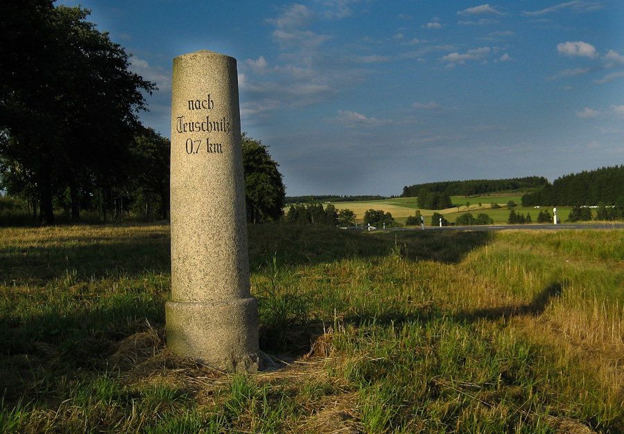 Ausgesprochen wellig quälte ich meine unwilligen Waden über Tschirn nach Teuschnitz, traf und überholte sogar einen Rennradler, der auf mein "Moin" so gar nicht reagieren wollte. Der örtliche Supermarkt hatte seine Mitarbeiter natürlich schon längst in den Feierabend entlassen...peso verfluchte den vorabendlichen Rotwein und dörrte in der Abendsonne bei lächerlichen Geschwindigkeiten vor sich hin. In Förtschendorf nahm ich mir den erst vorgestern entdeckten Waldweg nach Hirschfeld vor, kletterte mit teigigen Beinen nach oben und war über jede Photogelegenheit froh, die mir die untergehende Sonne in die Landschaft malte.