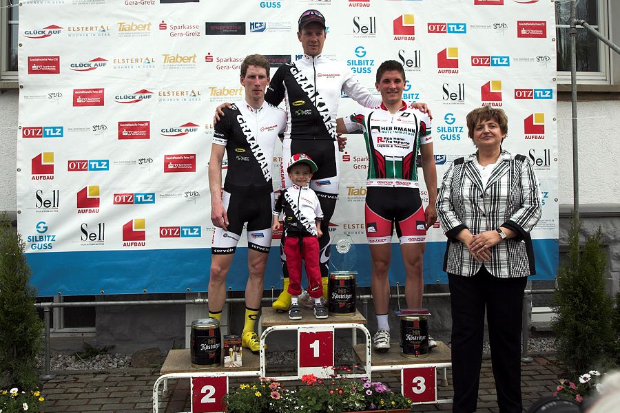Erst in der Schlußrunde kamen dann natürlich die Attacken, wobei ich selber nicht mehr glänzen konnte. Die erste Attacke konnte ich zwar noch mit einem anderen Fahrer zufahren, dann aber trat Kühmel an und flog nach vorn weg. Ich lag in diesem Moment in der Gruppe vorn, hielt einfach ein möglichst hohes Grundtempo am Anstieg und wollte mich dann ablösen lassen - aber keiner ging vorbei. Nochmal 300 m weiterstiefelnd ein zweiter, dann ein dritter Ablöseversuch - gleiches Spiel. OK, es bestand also kein Interesse, kein Wille oder keine Fähigkeit, den führenden Einzelfahrer zu stellen. Da wir nur ca. 30 s Vorsprung vor dem Feld hatten, und meine Alterklassen-Erstplatzierung in greifbarer Nähe war, wollte ich dies nicht durch ein ausuferndes Geplänkel riskieren. Also fügte mich in die mir zuerkannte Rolle, die Gruppe auch über die restliche Runde zum Ziel zu führen. Kurz vor der letzten Kurve wurden alle anderen wieder munter und droschen vorbei. Auf der sehr kurzen Zielgeraden waren keine Positionen mehr zu machen, so dass ich als Sechster (?) über die Linie kam und damit mein Teilziel der AK-Führung erreicht hatte. Insgesamt eine feine Ausbelastung, die vor allem durch Bangen, Hoffen und spätere Gewissheit wieder Mut für kommende Aktionen gemacht hat.