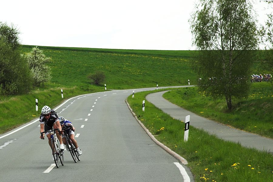 Kurz bevor ich denke, dass meine Investition völlig vergebens wäre, kommt in Runde 8 ein DKV-Express von hinten angeflogen. Lukas Hauptmann versorgt mich am Straßenrand stehend mit wichtigen Informationen über die anrollende Gruppenstärke und später über Zeitabstände - vielen Dank! Als der DKV-Express zu mir auflief, hiess es, sich nochmal tief in den Lenker zu krallen und in der letzten Welle des Anstiegs beschleunigend deren Tempo aufzunehmen. So hatten wir bei 60% der Distanz endlich eine 7er-Gruppe beieinander, die zumindest mittelprächtig lief. Zwar führten meist nur 3-4 Fahrer und auch die Fahrweise war noch nicht ganz konstruktiv, aber immerhin könnte man sich nun vor dem Feld behaupten. Für mich erfreulich: ich war der einzige Senior in der Gruppe. Also bestand meine Rolle darin, das Tempo hoch zu halten, um den Abstand vor dem Feld zu verteidigen. Ein spontanes Trinkflaschen-Anreichen mit Steffen Doerfer klappte bestens - auch hier vielen Dank! Zum Glück stellte sich nun in der Gruppe ein wenig Routine ein. Bis einschließlich der vorletzten Runde wurde zunehmend besser miteinander gefahren. Während dieser Rennphase konnte sich offensichtlich Sandro Kühmel noch in einer Alleinfahrt vom Feld lösen und die 30 s zu uns zufahren.
