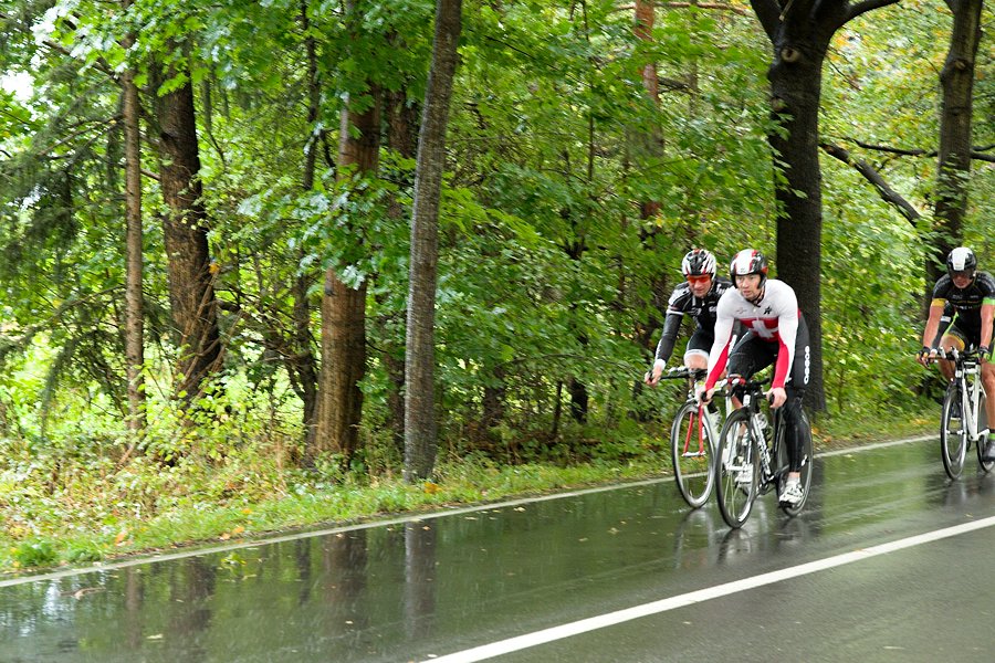 Die Kräfte unseres Ideenstifters Micha schwanden ab Mitte der 2. Runde sichtlich, die Kurvendurchfahrten und Anstiege raubten ihm das letzte Korn. So musste er gegen Ende der 2. Runde nach 30 km Fahrdistanz reissen lassen. Bis dahin hatte er aber auf den Geraden sehr gut gearbeitet und seinen Teil zum Erfolg geleistet! Die letzten 20 km wurden dann im Trio bewältigt. Jeder klemmte sich nun etwas länger in seine Führungsschläge hinein und die gefühlte Intensität stieg aufgrund der aufkeimenden Erschöpfung an, obwohl die Rundenzeiten wie mit der Uhr gestellt nahezu konstant blieben. Gefühlt oder wahrhaft frischte aber auch der Wind auf, so dass zumindest ich auf den letzten 5 km das Ende schon sehr herbeisehnte. Zum Schluss nochmal alles hieinwerfend, wieder eine riskante Situation mit einem Auto, welches mitsamt Hänger die letzte Kreuzung blockierte, dann ging es durch die "grüne Hölle" in die Zielgerade und mit einer mittleren 1:07er-Zeit über die Zeitmessung.