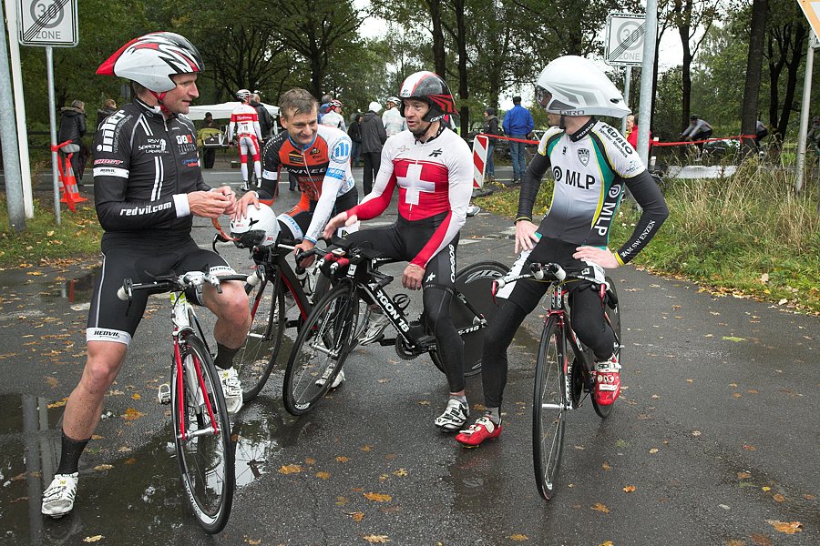 Um 12 Uhr waren dann alle auf dem Parkplatz versammelt und die Nummern wurden abgeholt. Bevor es auf die Besichtigungsrunde gehen konnte, begann es auch gleich heftig zu prasseln. In die Autos verkrochen warteten wir das schlimmste Nass ab und rätselten, ob das Rennen so gestartet werden könne. Vor dem gleichen Rätsel standen wohl auch Veranstalter und Polizei, so dass man beschloss, den Start um eine halbe Stunde zu verlegen, da die dicksten Schauer bis dahin durchgezogen sein könnten. Wir beschlossen, 10 min vor dem nun auf 13:30 Uhr verlegten Start eine Besichtigungsrunde zu drehen. Um halbwegs immun gegen Böen und Defekte zu sein, beschloss ich, es bei meinen 50 mm Laufräder mit Conti Clinchern zu belassen. Tino wechselte gar noch den Hinterreifen an seiner Scheibe von Veloflex auf Conti, um auch genügend Nasshaftung zu haben.
