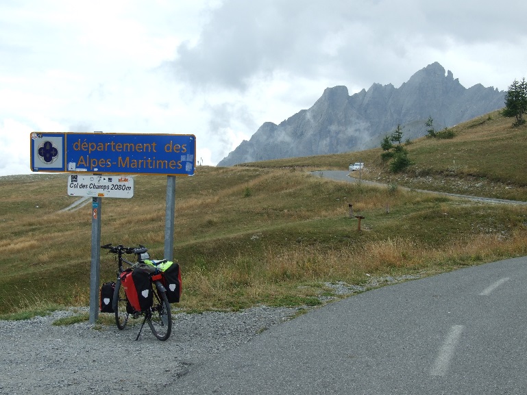 Heute früh hängen die Wolken tief und manchmal tröpfelt es, aber alles kein Grund, nicht auf's Rad zu steigen. Ich pendle mich in Richtung Norden ein, um den ersten Pass in den Alpen zu bezwingen. Die ersten Kilometer verlaufen sanft ansteigend im Tal des Verdon. In Colmars, einer Ortschaft mit einem gut erhalten mittelalterlichen Ortskern, tanke ich Vorräte auf. Hier beginnt der im ganzen Verlauf absolut verkehrsarme Pass gleich mit einem ordentlich heftigen Einstieg. Sehr enge Serpentinen sind an diesem steilen, bewaldeten Hang zu bezwingen, von denen man ab und zu einen herrlichen Blick auf Colmars hat. Im weiteren Verlauf wird die Qualität des Straßenbelags schlechter, bleibt aber durchaus fahrbar. Bergab macht es hier aber bestimmt keine Freude. Das Wetter schwankt zwischen leichtem Regen und ein paar kurzen sonnigen Abschnitten. Weiter oben wird der Wald lichter, aber man sieht nicht, wohin es eigentlich noch gehen soll. Kurz vor der Passhöhe wähnt man sich dann auf dem Mond: graue Geröllfelder ohne Vegetation. Das Schild für den Pass steht nicht ganz auf dem höchsten Punkt, aber egal. Ich halte mich nicht lange auf, denn hinter mir ziehen dicke Wolken den Berg hoch. Auf der anderen Seite des Passes, die ich als Abfahrt nehme, ist die Straße sehr gut ausgebaut und es macht Spaß, die kurvige Straße herunterzusegeln.