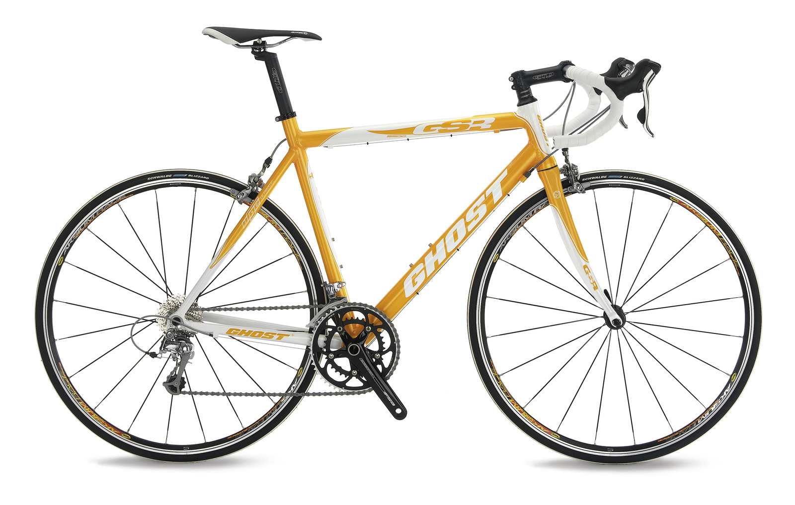 Achso mein kleiner Liebling ist ein Ghost Race mit 105er Komplettausstattung, Rahmen: 7005 T6 multibutted URGE und Schwalbe Blizzard Kevlar Reifen