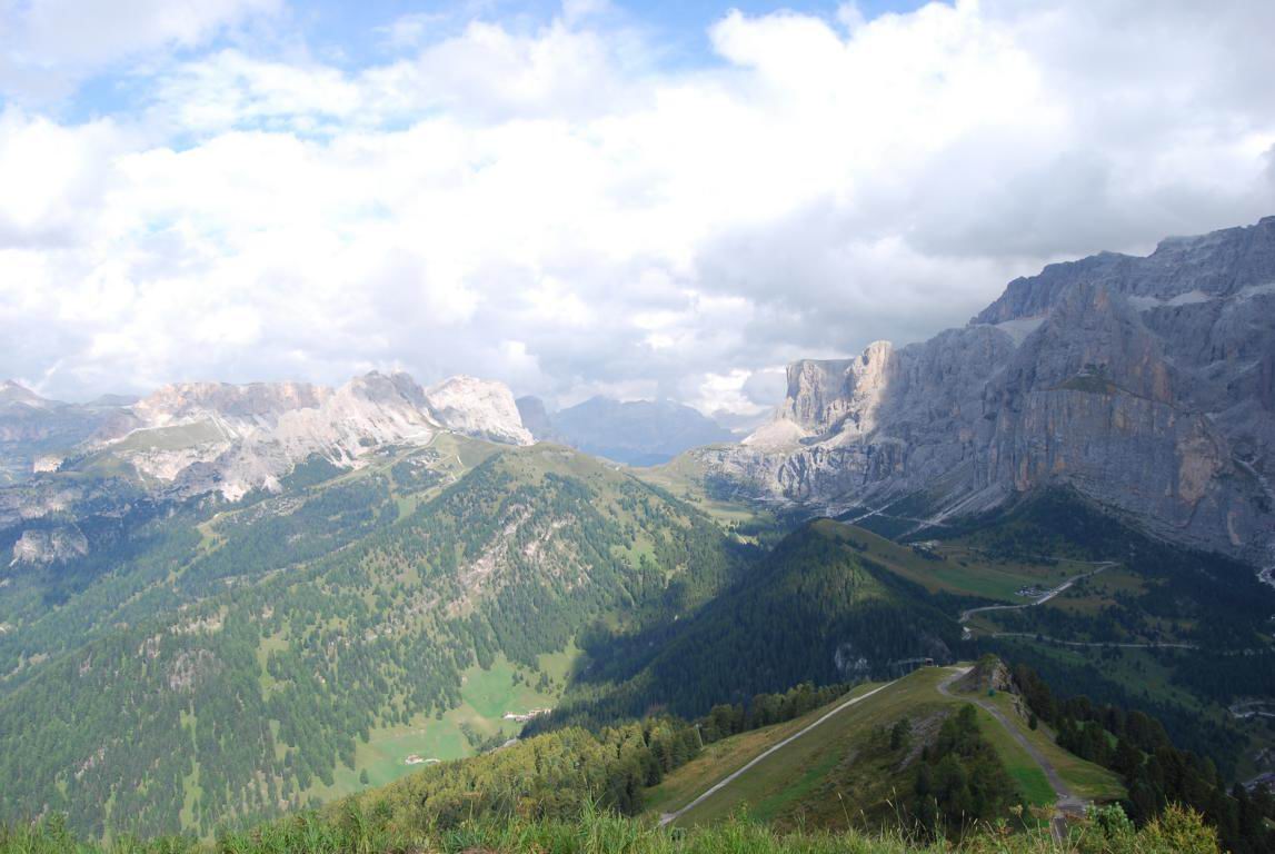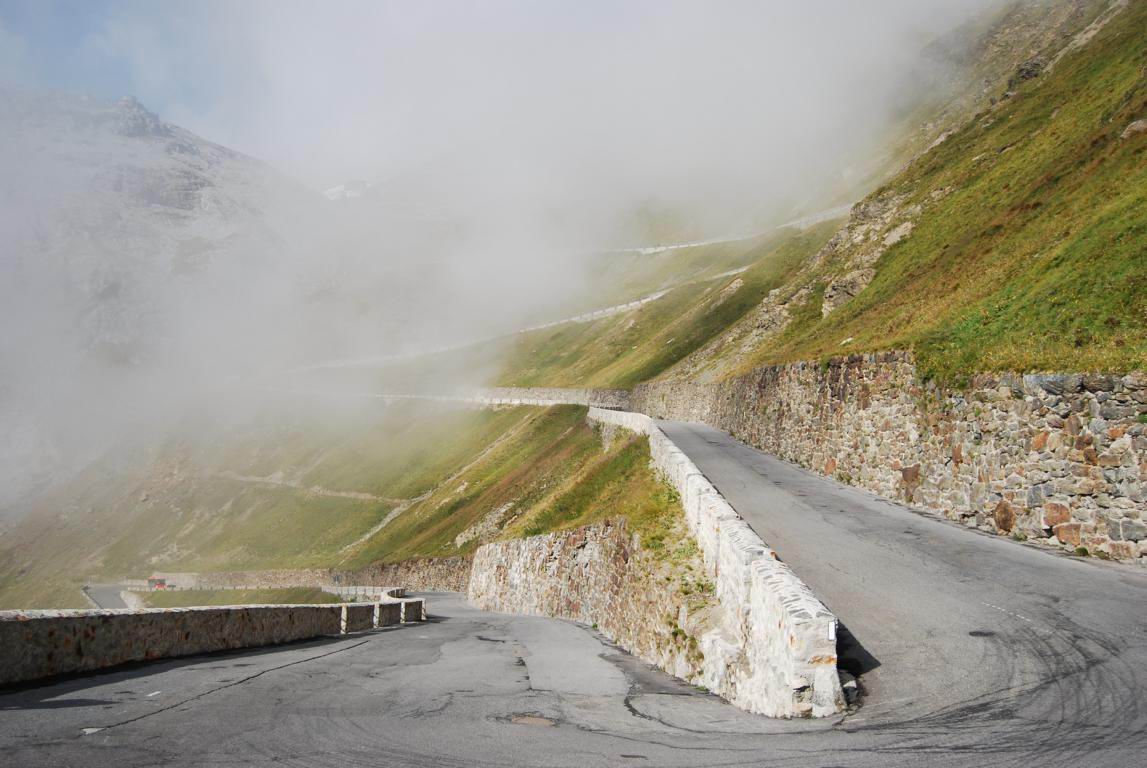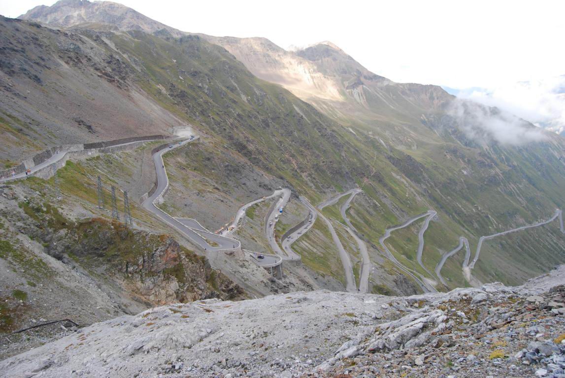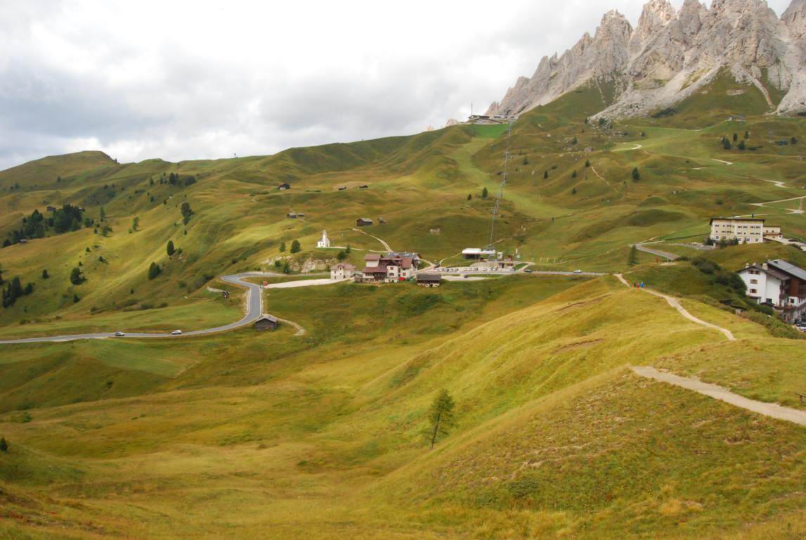 der Stelvio, der Forcola bei Livigno, am Grödner Joch (Gardena), am Sella Joch und ein Wandersmann bei Knieübungen :-)