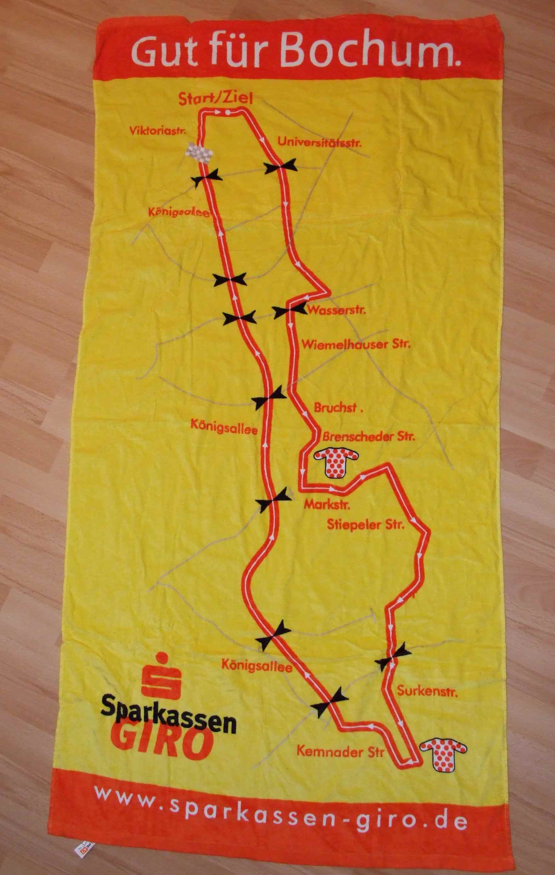 Das Badelaken, welches den Wespen und Bienchen bestimmt viel Freude bereiten wird, zeigt den ursprünglichen Streckenverlauf, der bis letztes Jahr halt noch galt. Dieses Jahr haben sie die Strecke für die Jedermänner umgebaut, da mittlerweile einfach zu viele auf dem Kurs unterwegs sind.