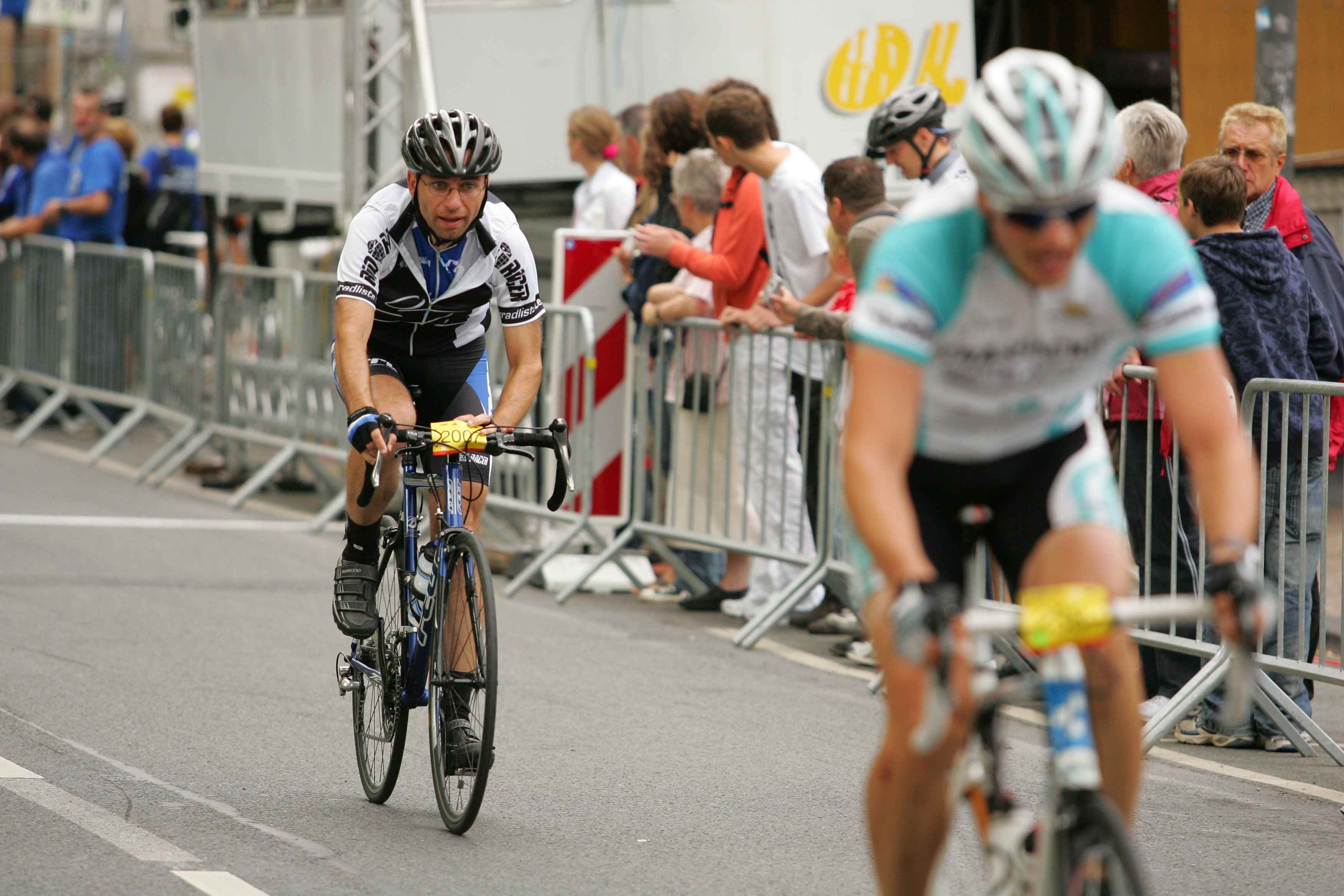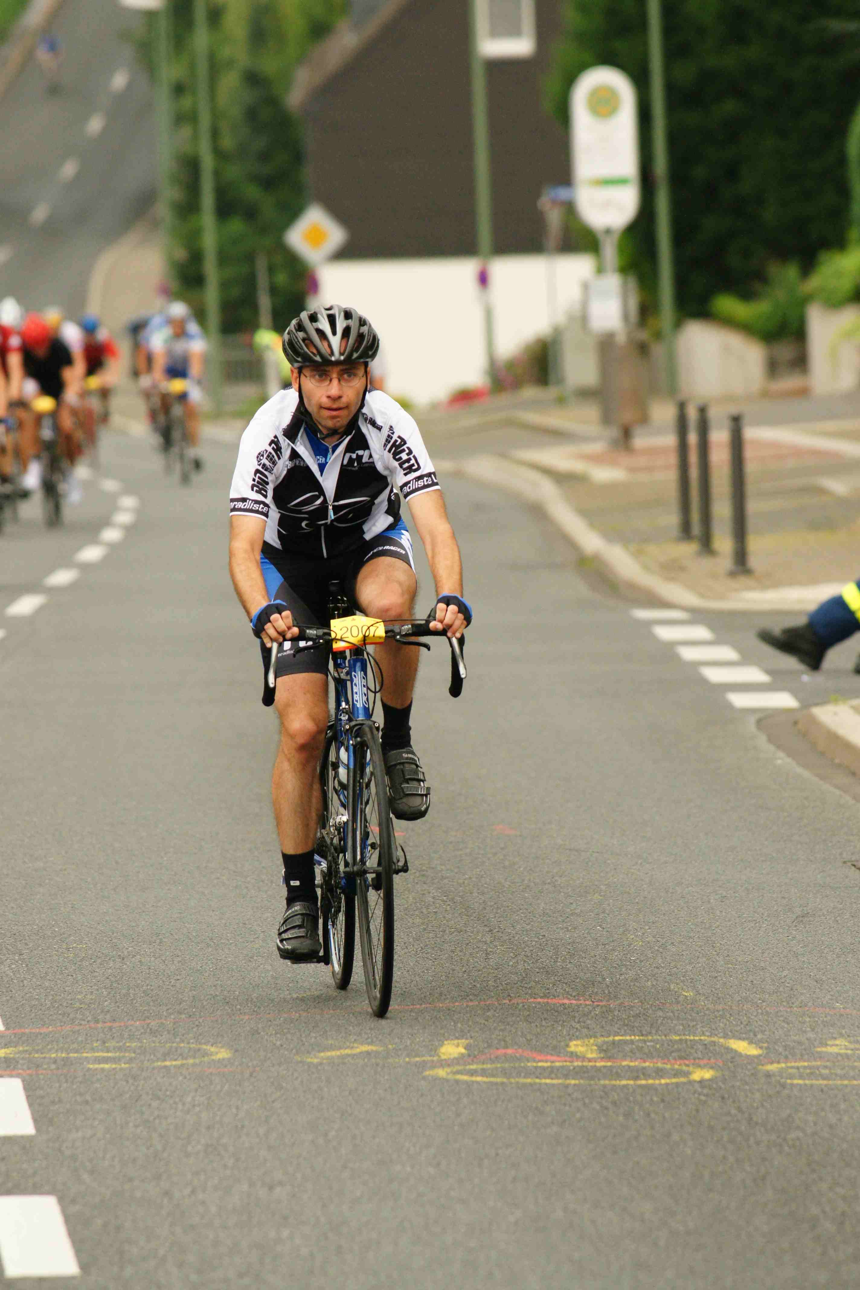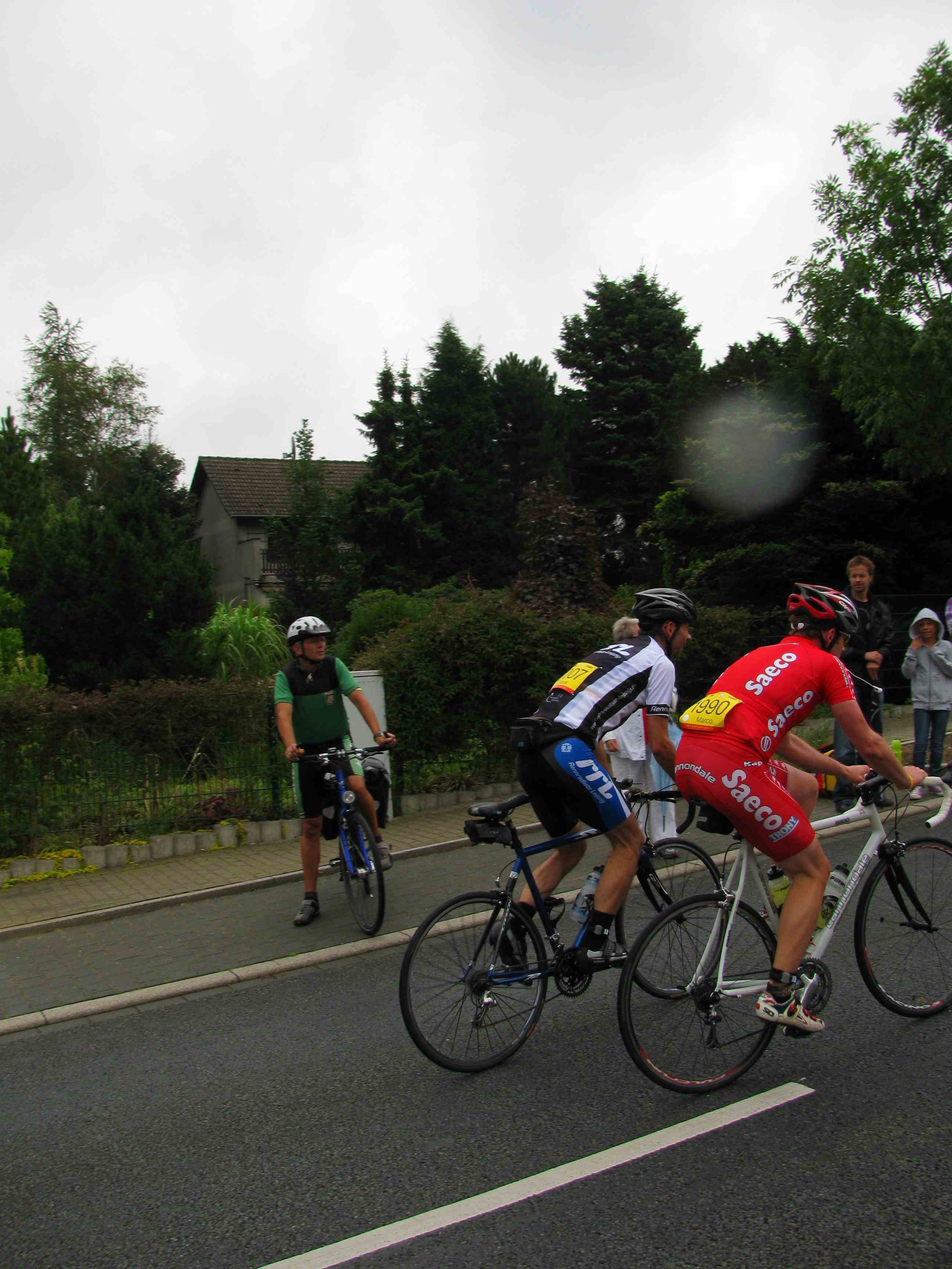 Es ging vorsichtig und kurvig los durch die Innenstadt und nach den ersten Kilometern kam plötzlich eine Kopsteinpflasterpassage. Da auch noch eine Trinkflasche so langsam von rechts nach links über meine Bahn kullerte dachte ich, das war’s jetzt. Zur Seite konnte ich in der Gruppe nur bedingt ausweichen und bremsen wollte ich auf dem feuchten Untergrund nicht. Also Lenker festhalten und durch. Glück gehabt, die Flasche habe ich knapp verfehlt. Es tröpfelte wieder. Weiter gings über einen sehr sachten Anstieg, Gruppenfindungsphase war angesagt. Ein paar Kurven weiter die schönste Stelle der Runde denn es ging über eine dreispurige gemäßigte Abfahrt an der Ruhr-Uni (ein wirklich hässlicher Beton-Bau der 70-er) vorbei. An deren Ende wurde man unsanft mit einer Lautsprecheransage angebrüllt, man solle doch auf dem nächsten Streckenabschnitt gefälligst aufpassen. Einige enge Kurven waren zu meistern und die Strecke verlor sich fast auf einem etwas holperigen Radweg. Weiter ging es durch ein ländliche, grüne Landschaft in eine enge Strasse hinein. Dort hatten nur zwei Radler nebeneinander Platz: rechts der Straßengraben, links ein Absperrgitter zur Gegenfahrbahn. War nicht so toll! Nach einem längeren einfachen Anstieg durch das Lottental kam es zum ersten Showdown: der Anstieg nach Stiepel. Erst so ungefähr 8-10%, eine Zwischenabfahrt um dann sofort wieder mit 10-12% voll reinzugehen. Hier konnte ich aus meiner Gruppe nach vorn rausfahren, in die anschließende lange Abfahrt bis ins Ziel musste ich allerdings mehr oder weniger allein. Unterwegs habe ich noch ein Seniorenfahrer aus dem Muldental getroffen, aber als ich ihm ein Teambildung der sächsischen Radler anbieten wollte, war er auch schon hinten wegegefallen.